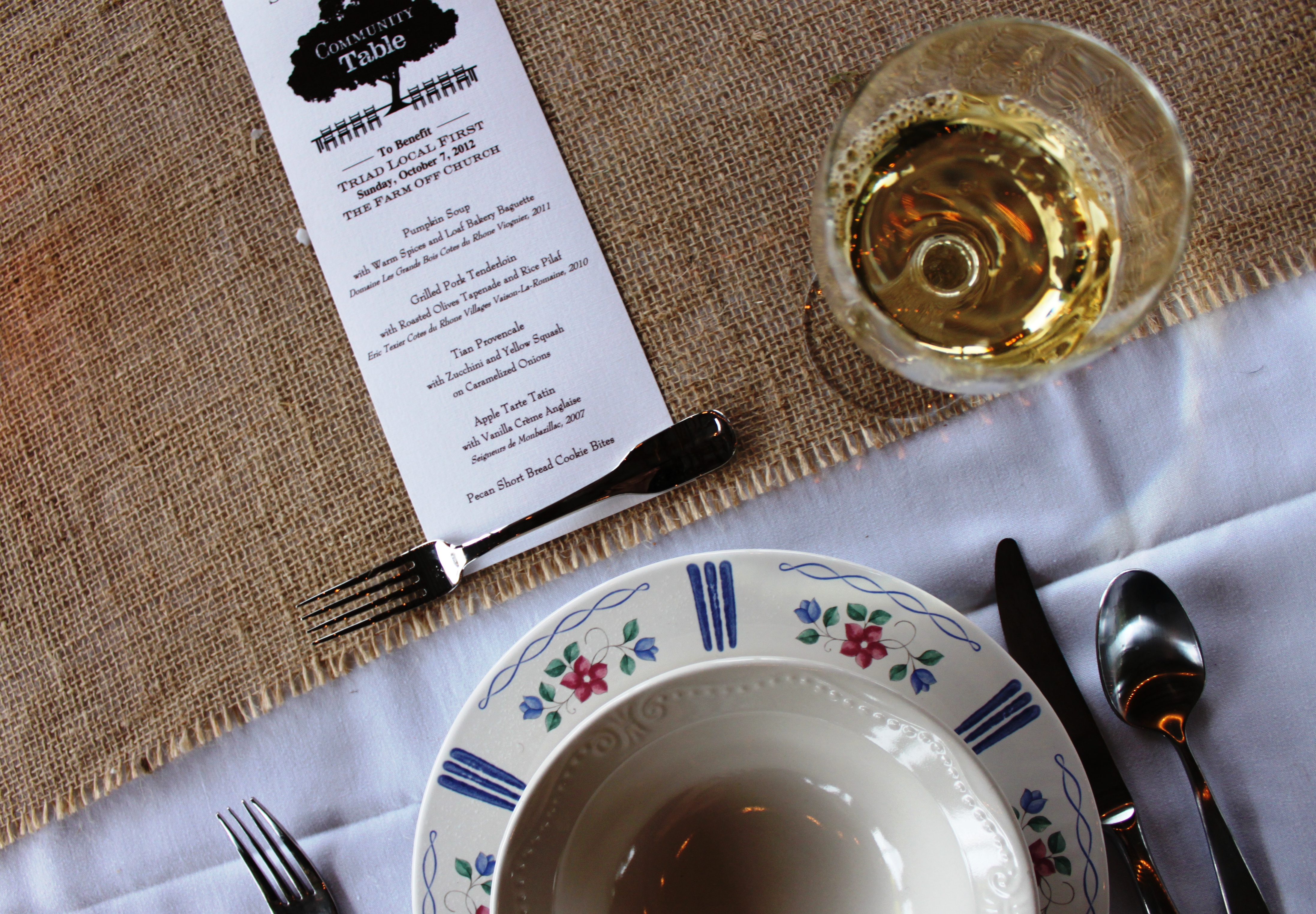 Swiss born and French trained chef, Reto Biaggi, took on the challenge this year to prepare a sophisticated menu highlighting local foods and seasonal fare. Passed hors devours of Goat Lady Cheese and fried green tomatoes, local Rudd Farm pumpkin soup with warm spices, grilled pork tenderloin with tapenade, a tian provincial and seasonal apple tarte tatin were served family style at a long table set for the entire party. Donations from member organizations made the dinner possible, from large businesses – like Replacements, Ltd. providing the china – to independent food producers like Red Oak Brewery, Zeto Wines, Gallins Family Farm, Cafegency Organic Bean Coffeehouse, Loaf Bakery, and Babycake Sweets.