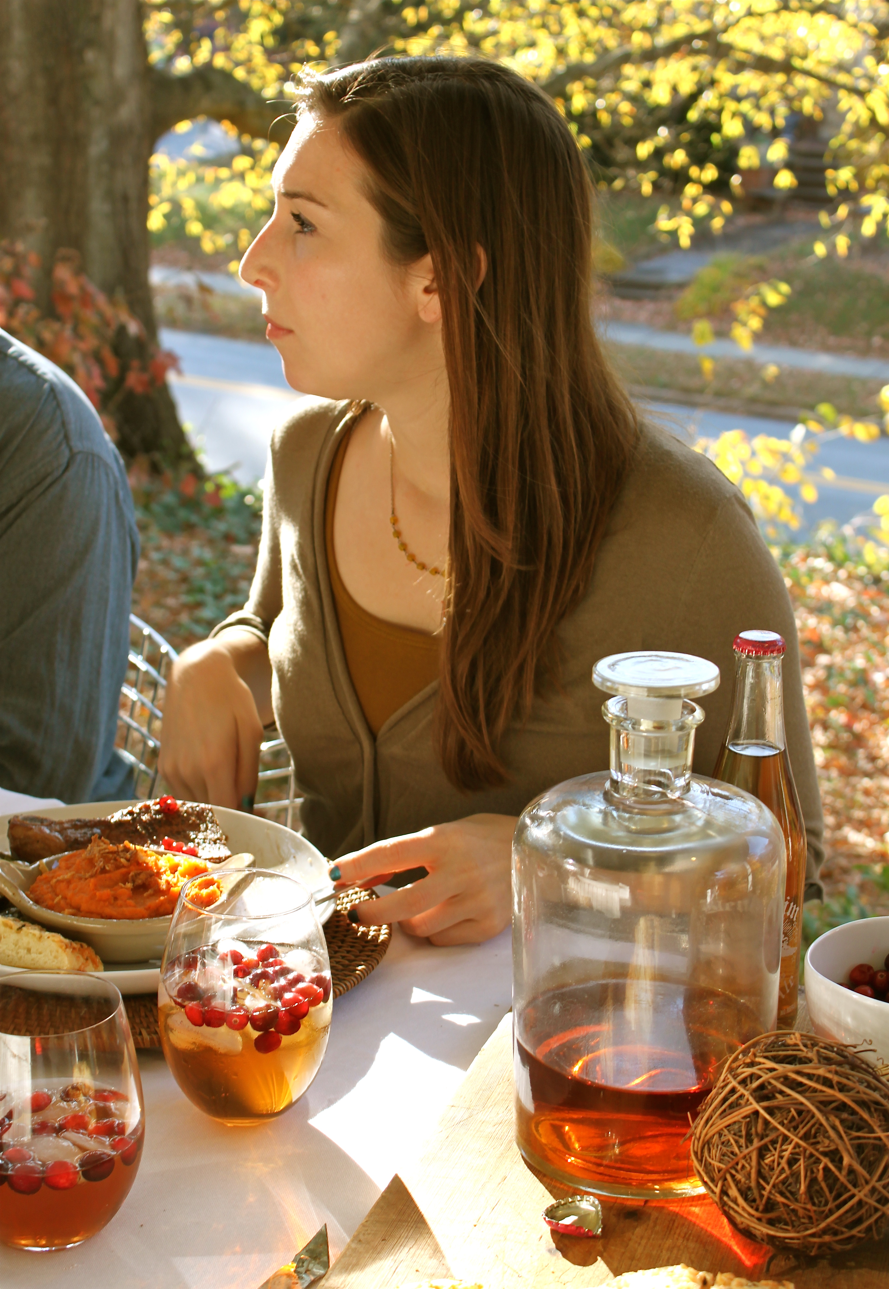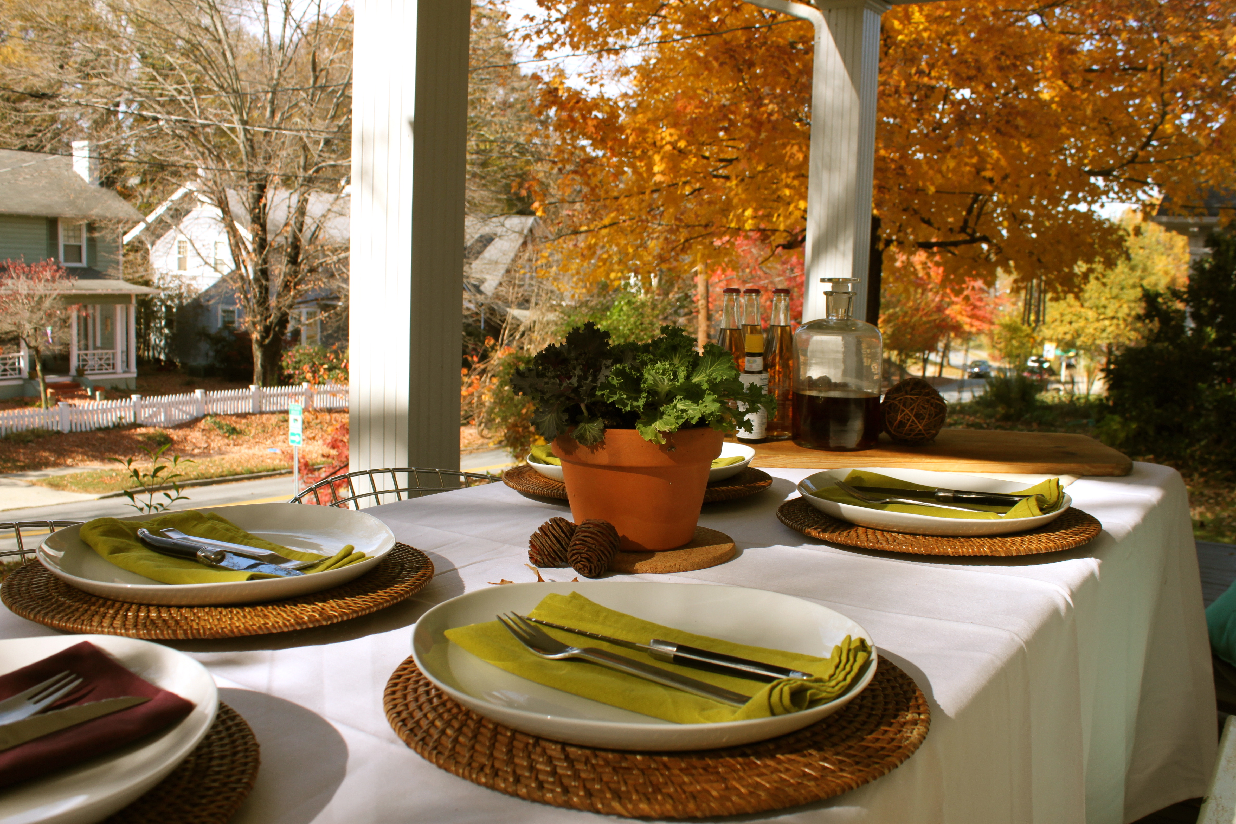So, before all the tradition of un-turkey day and big birthdays, I invited some friends over this weekend enjoy the Fall light, share a meal and gaze at the spectacular color on Mendenhall Street. It couldn’t be more beautiful watching cyclists and joggers breeze by with the surprise of warm weather. To take full advantage, I set up a dining table directly on the front porch! We enjoyed a menu full of fall ingredients that were spiced up a bit for the occasion. Sweet potatoes whipped with red curry paste and coconut milk, pan roasted pork chops with fresh pomegranate and a molasses glaze and slightly sticky brussels sprouts with balsamic vinegar and bacon. I put the meal together in little time (after a late morning in bed with coffee, the dog and a lot of news coverage) and allowed the colorful menu blend in with the orange, red and yellow of the environment. We washed it all down with spicy cocktails of tart fresh cranberries, spicy ginger ale and bourbon.