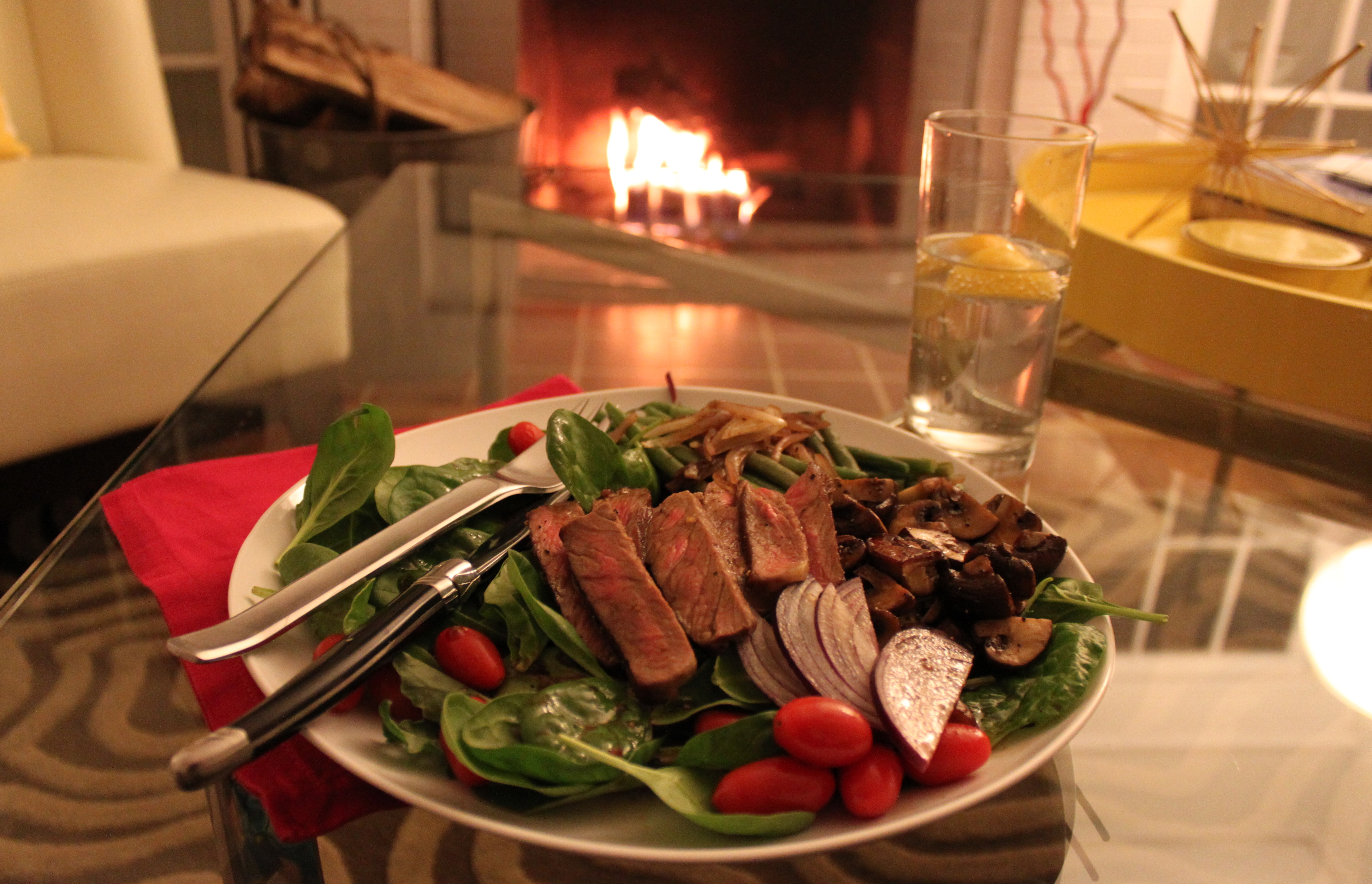 This January, I’m trying to do less and relax more. But, that also includes a healthy dose of time at the gym and hearty, healthy and homemade meals by the fire. With NY Strip Steaks on sale every Saturday at The Fresh Market, I can’t help but take advantage of the deal and make a variety of salads that fit the bill for January and also satisfy me on weeknights after the gym! This is the first of three salads for the season – stay tuned!