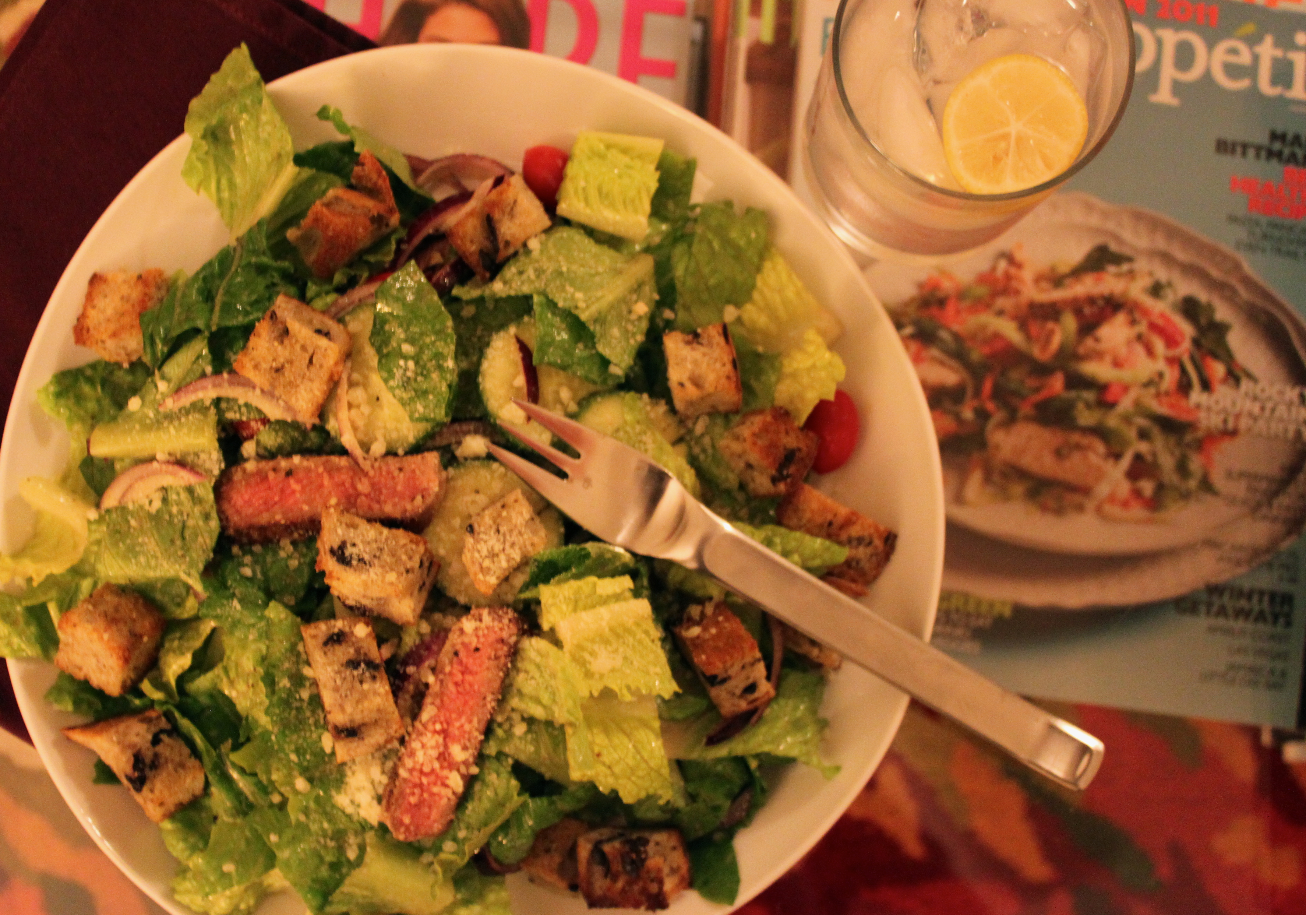 Despite the cold rain, last night was super relaxing. I’m always trying to make my home more of an oasis – a place I want to be to relax and feel comfortable. Last night on the sofa in bathrobe with dog at my feet and Anthony Bourdain on the tube – oh so good. And, this easy lighter caesar salad with my Fresh Market $6 NY Strip Steak after the gym! I mixed romaine lettuce, grape tomatoes, cucumber and pan seared steak with good croutons and a homemade light caesar vinaigrette. Really quick and filling.