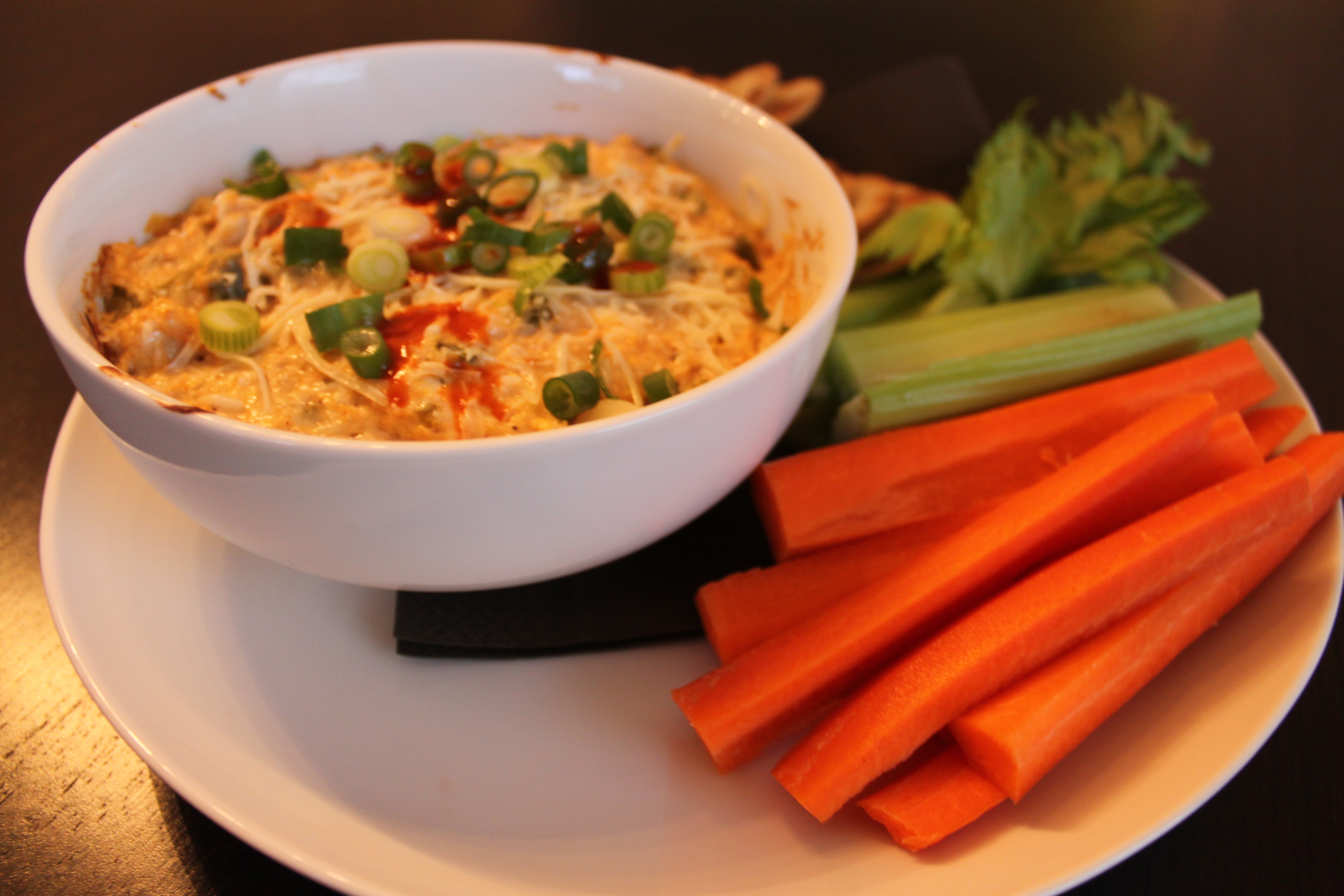 Preheat the oven to 400 degrees. In a sauce pan, melt the butter. Add chopped onion, pepper, celery and garlic. Season with salt and pepper and allow to cook down until slightly brown. Meanwhile mix in a large bowl, crab meat, cream cheese, mayo, parm, scallions, and the rest of sauces and seasonings. Once mixed well, add in the cooked vegetable mix. Add to a oven-proof dish and bake for about 30 minutes or until bubbly. Garnish with extra scallions and serve with crackers, carrots and celery!