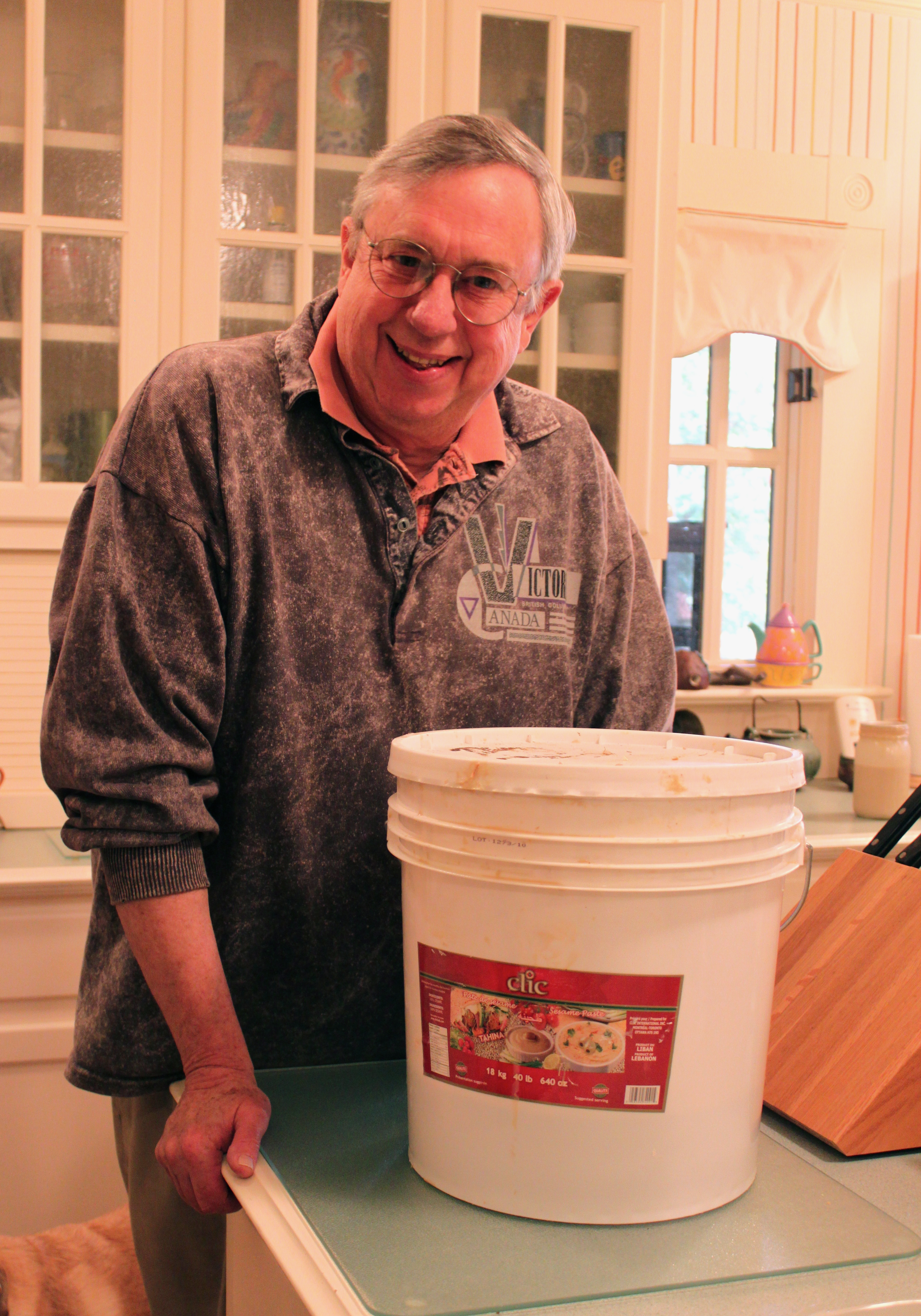 Winslow’s first memory of hummus is somewhere between the Mediterranean and  North Africa around 1966 when he was studying “everything other than growing up in Eastern North Carolina” in the South of France. Years later he began making homemade hummus after reading a recipe in Cooks Illustrated Magazine on restaurant quality hummus. And today, he is a proud owner of his second 40 pound bucket of tahini – the sesame paste that is an essential ingredient in hummus. He makes that much hummus!