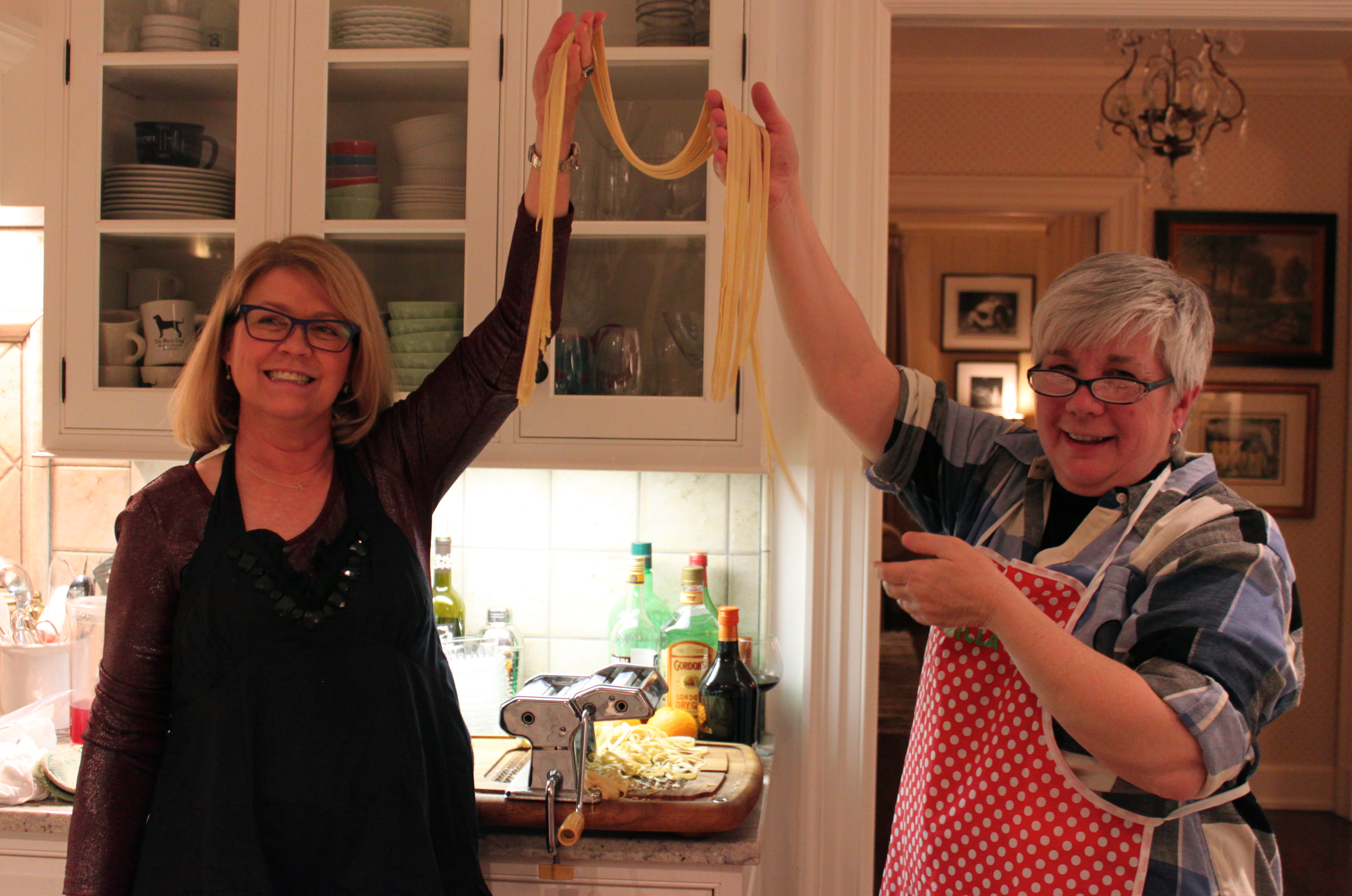While making fresh pasta was fun – we needed some sauce to turn it into a cozy meal. We tossed the extremely long strains of linguini into three homemade sauces – a Seasonal Winter Pesto, a Wild Mushroom and White Wine and a Spicy Sausage Sauce. All were really tasty and complimented the homemade noodles really well. I made the sauces somewhat in advance and finished each off with fresh herbs before serving. The favorites were surely the mushrooms and sausage!