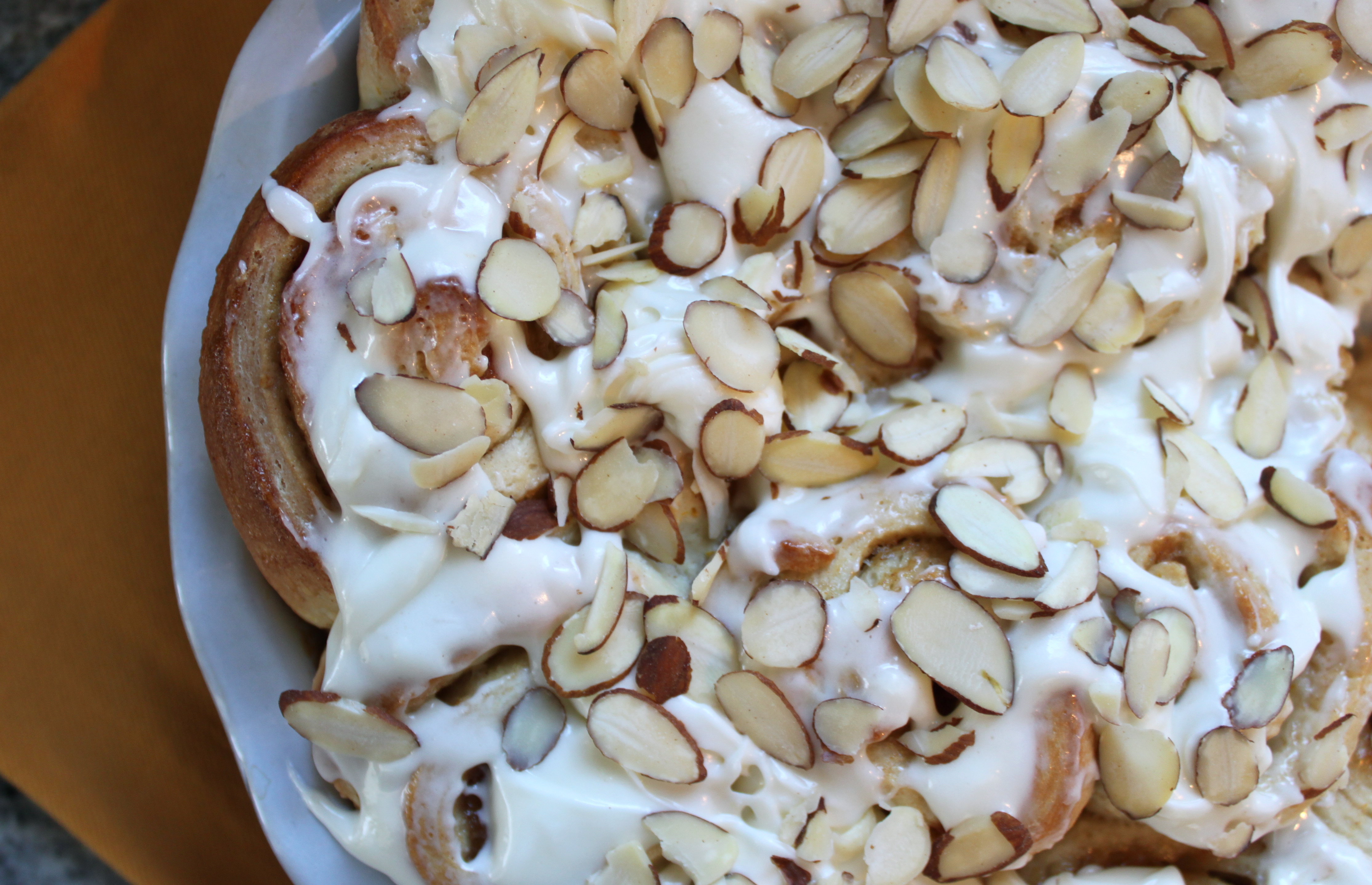 In a large bowl, beat cream cheese and butter at medium speed with the whip attachment of an electric mixer until smooth. Add confectioners’ sugar on low speed until combined. Beat at high speed until fluffy. Spread icing over warm orange rolls. Sprinkle with almonds.