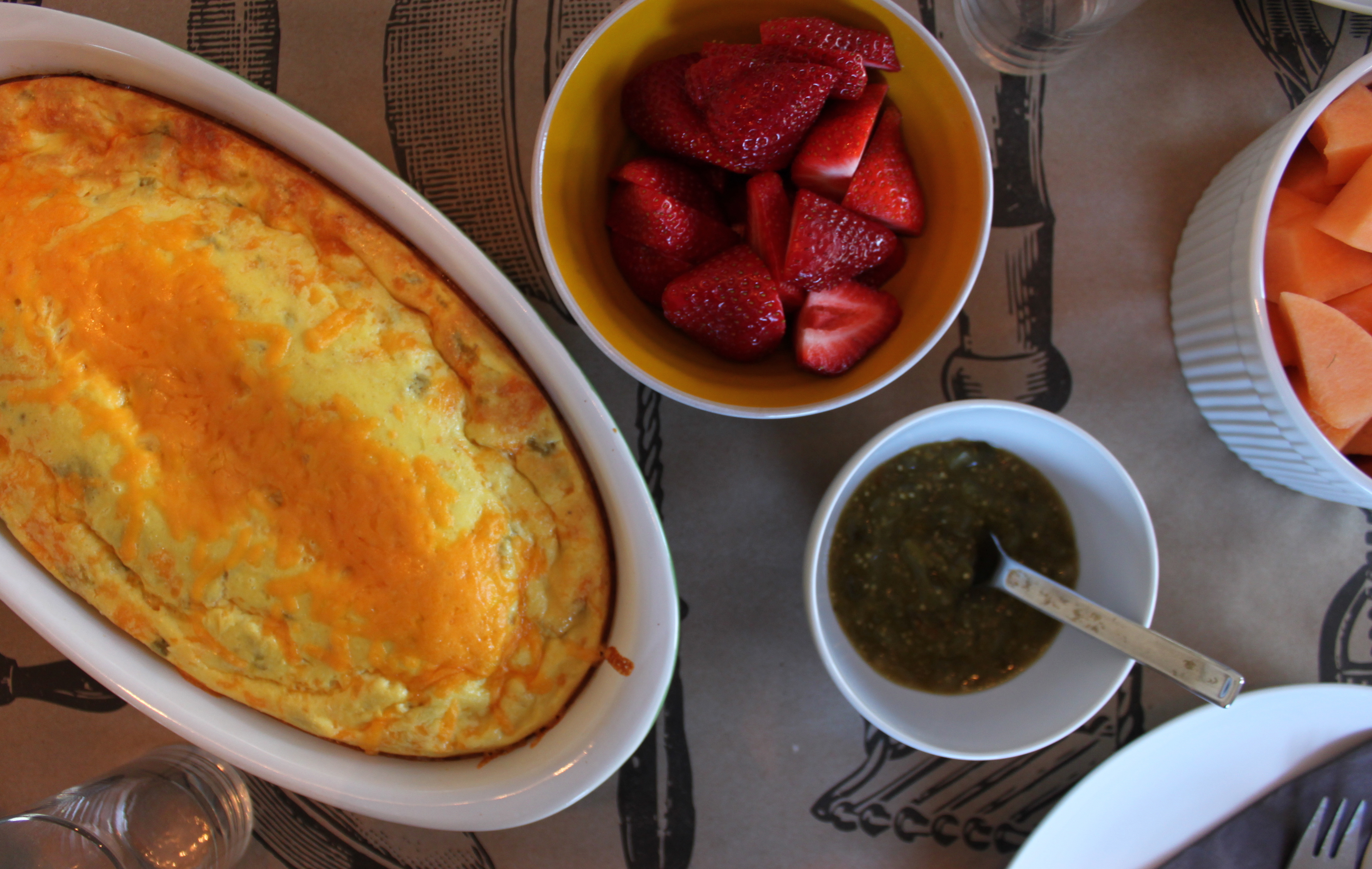 Assembly: Preheat the oven to 350 and grease a large casserole dish. Sprinkle cheese on the bottom of the dish and then layer the green chilies on top. Whisk together eggs, salt and sour cream and add the mixture to the dish. Add a bit more cheese! Bake for about 45 minutes to an hour or until set. Serve with additional salsa verde!
