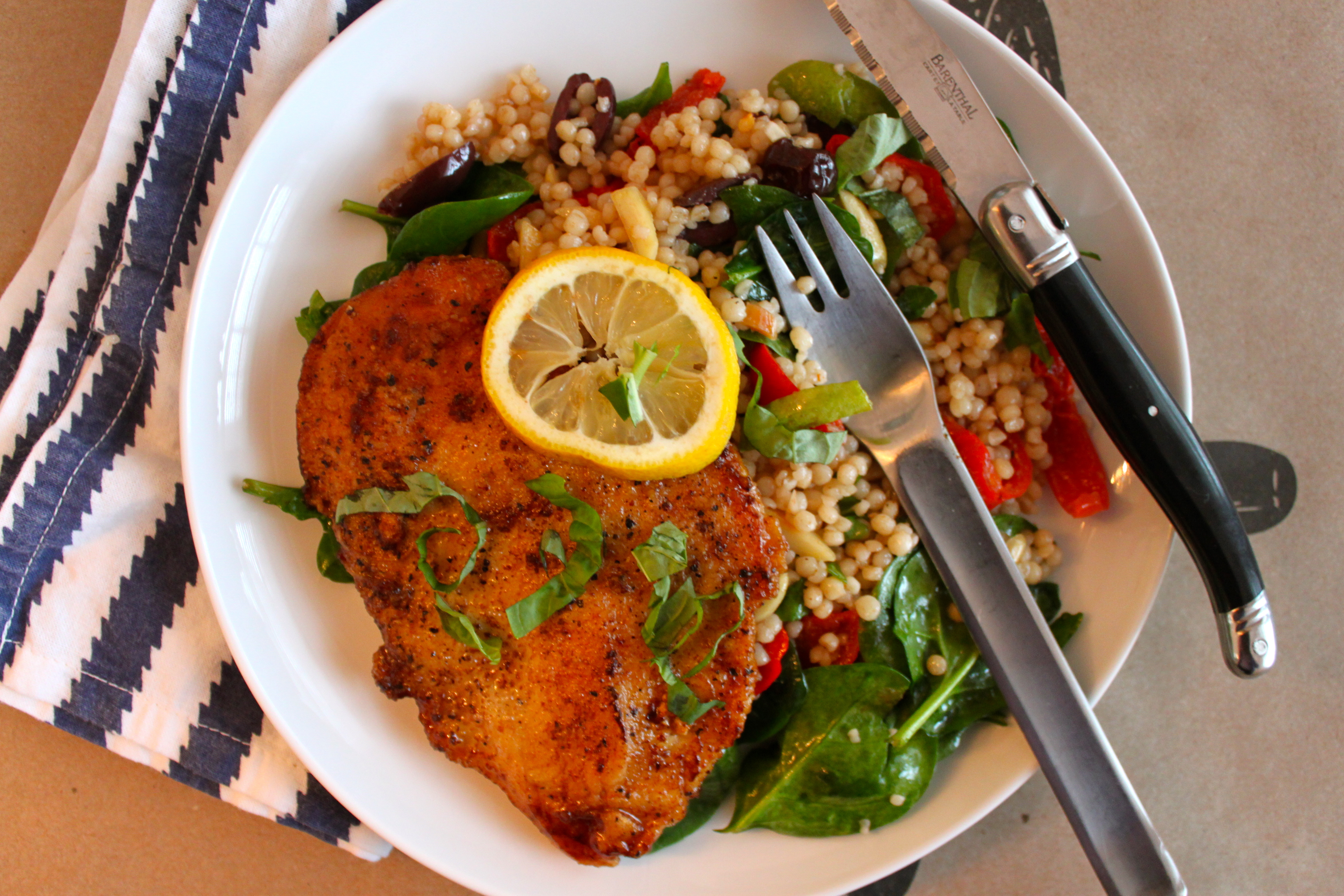 With a new view, I put away my Monday -worries on Sunday and spent some time in the kitchen. I made a simple Israeli couscous salad to eat through the work week. I tossed in the pantry – lemon juice, balsamic vinegar, olive oil, piquillo peppers, black olives, basil, dried cherries, fresh spinach and toasted almonds. Sweet, salty and really additive. With an easy chicken cutlet sauteed in butter, olive oil and lemon juice – it was the perfect early supper for a quiet Easter Sunday. The leftovers are great cold the next day too!