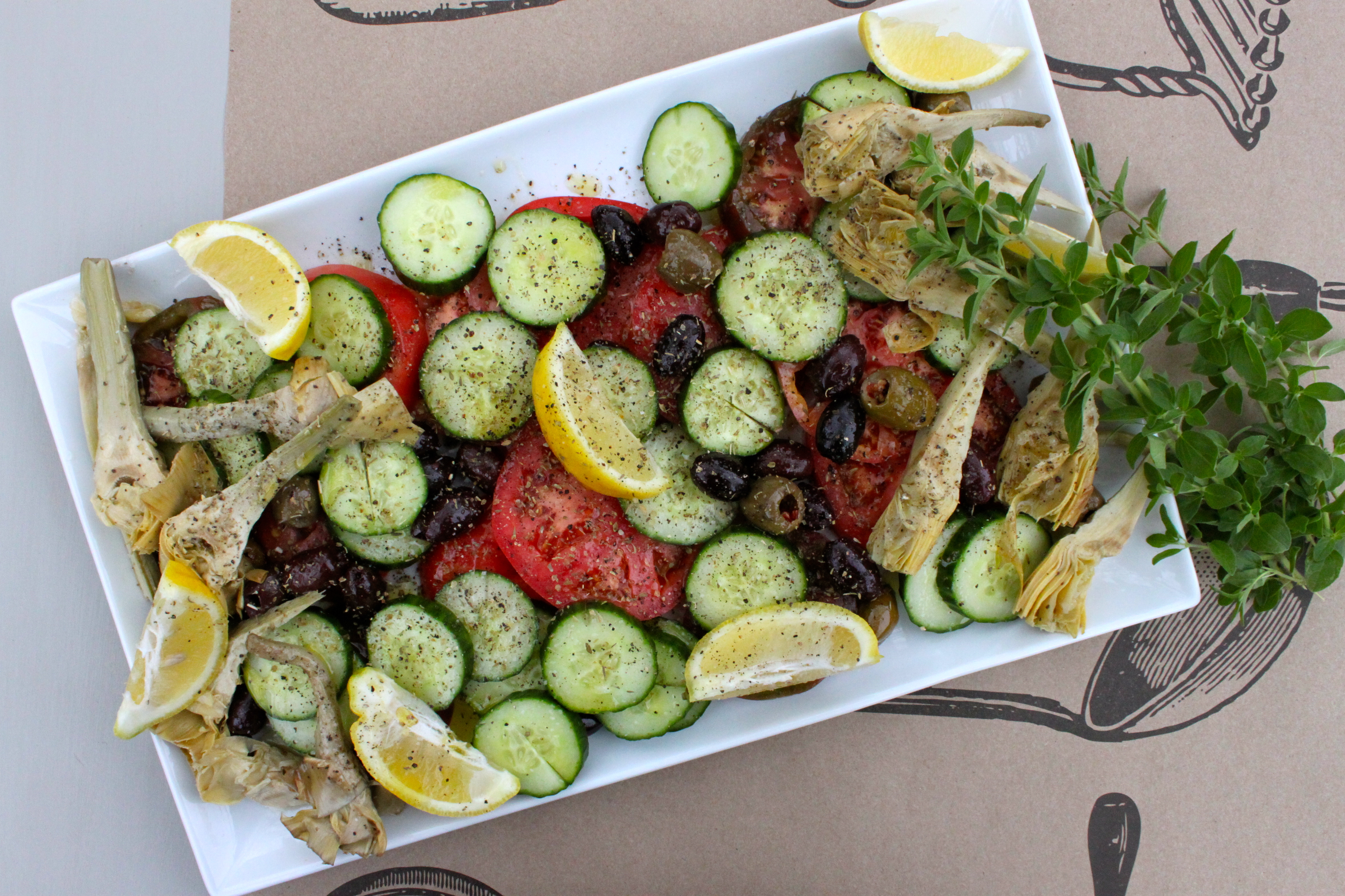 Grab a couple of beautiful heirloom tomatoes, an english cucumber, olives and whole marinated artichokes from the grocery store olive bar – chop them up and throw them on a platter. Dress with lemon wedges, a splash of good olive oil, salt, pepper and dried oregano. Serve like a star – or like Betty Draper. As I keep thinking of her saying “Go bang your head against the wall. Only boring people are bored.”