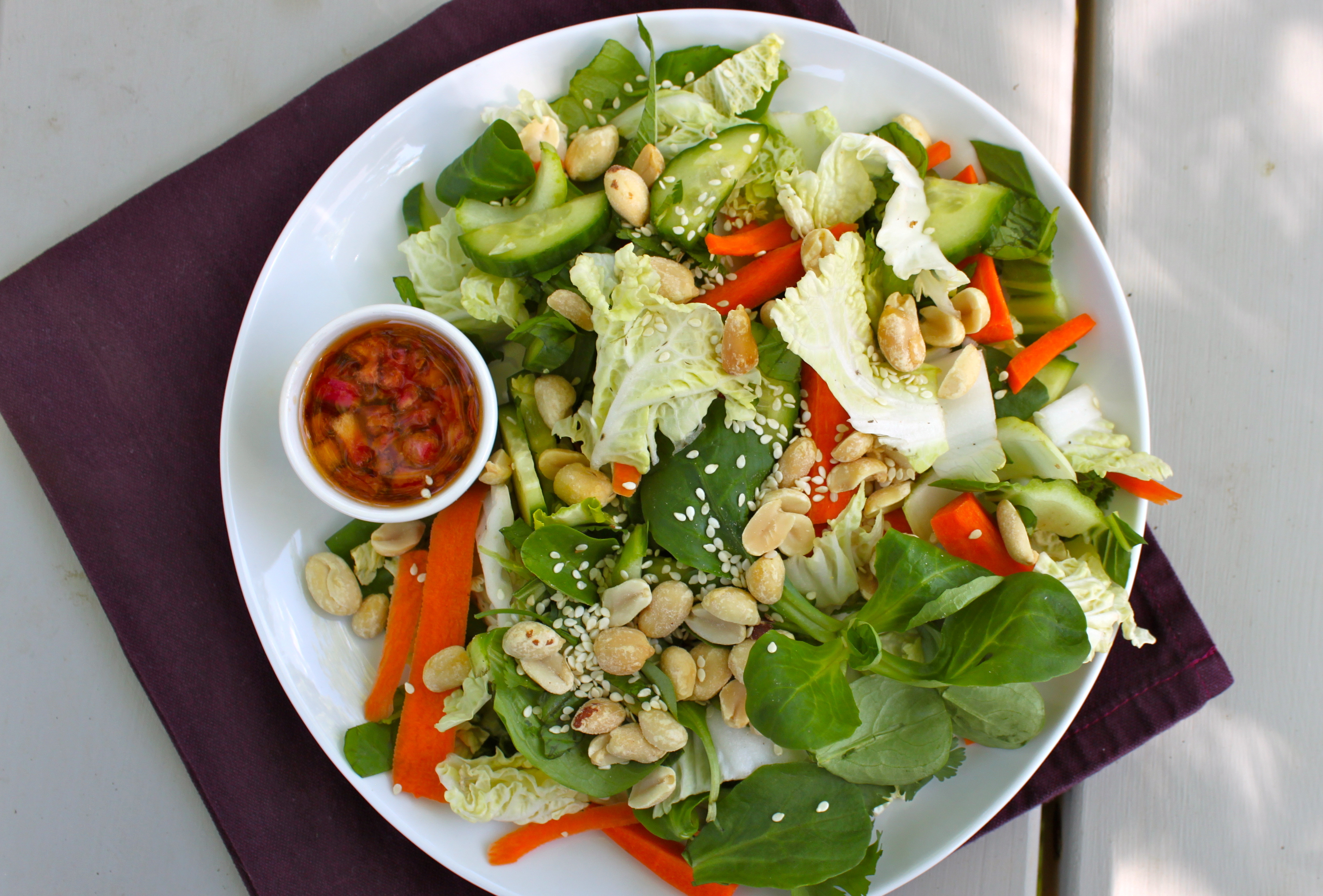 Toss the bok choy, cabbage, watercress, carrot, herbs, cucumber, chili and 1/4 cup of the peanuts together with enough dressing to coat.