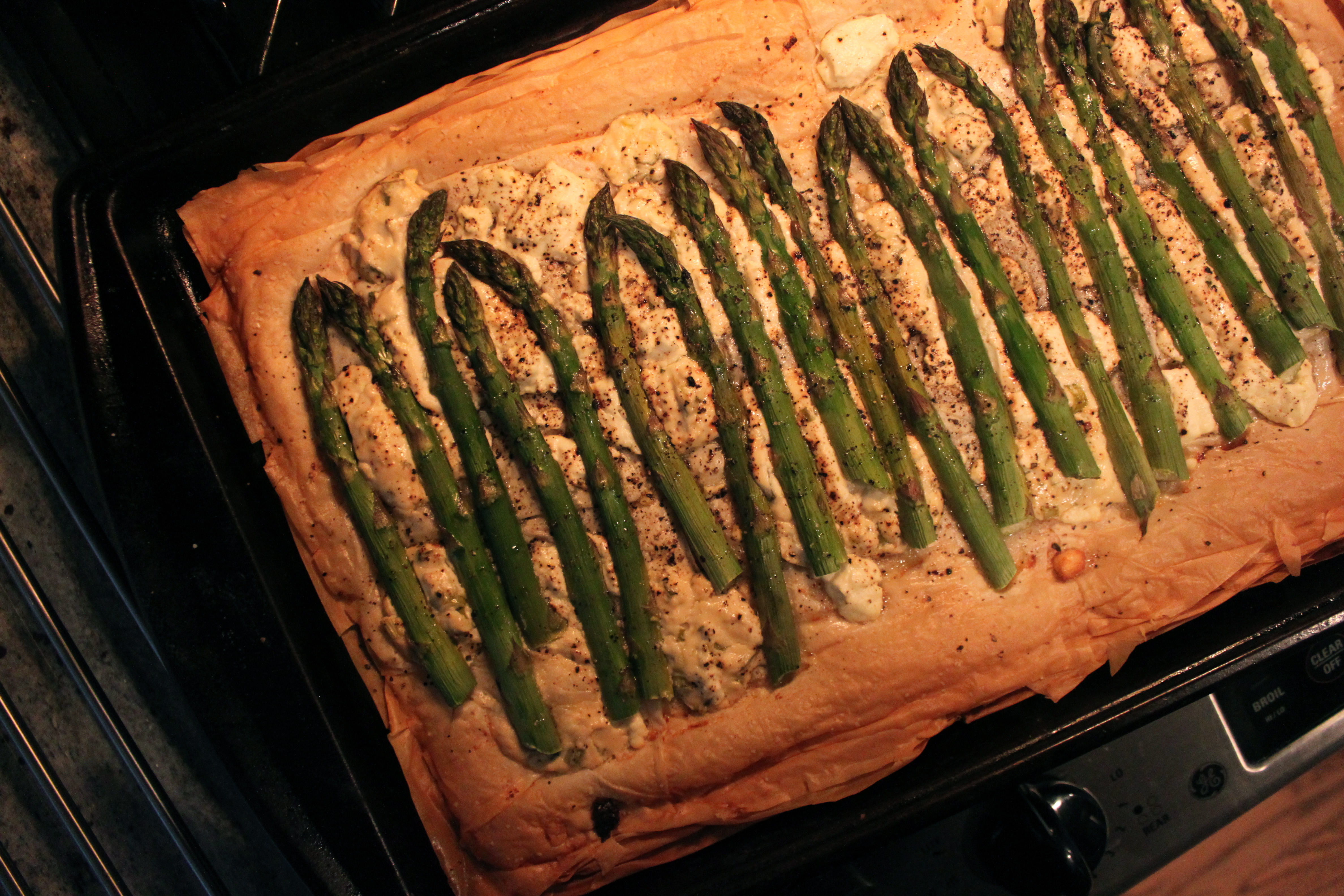 Preheat the oven to 400 degrees. On a parchment paper lined cookie sheet, layer phyllo dough and brush with butter in-between each layer. Be careful – this stuff is fragile! After about 10 or 12 layers (or however many you’d like), smear (or mash!) the goat cheese on top of the dough. Press the asparagus on top of the cheese. Bake for about 30 minutes – until dough is brown and flakey and asparagus is tender.
