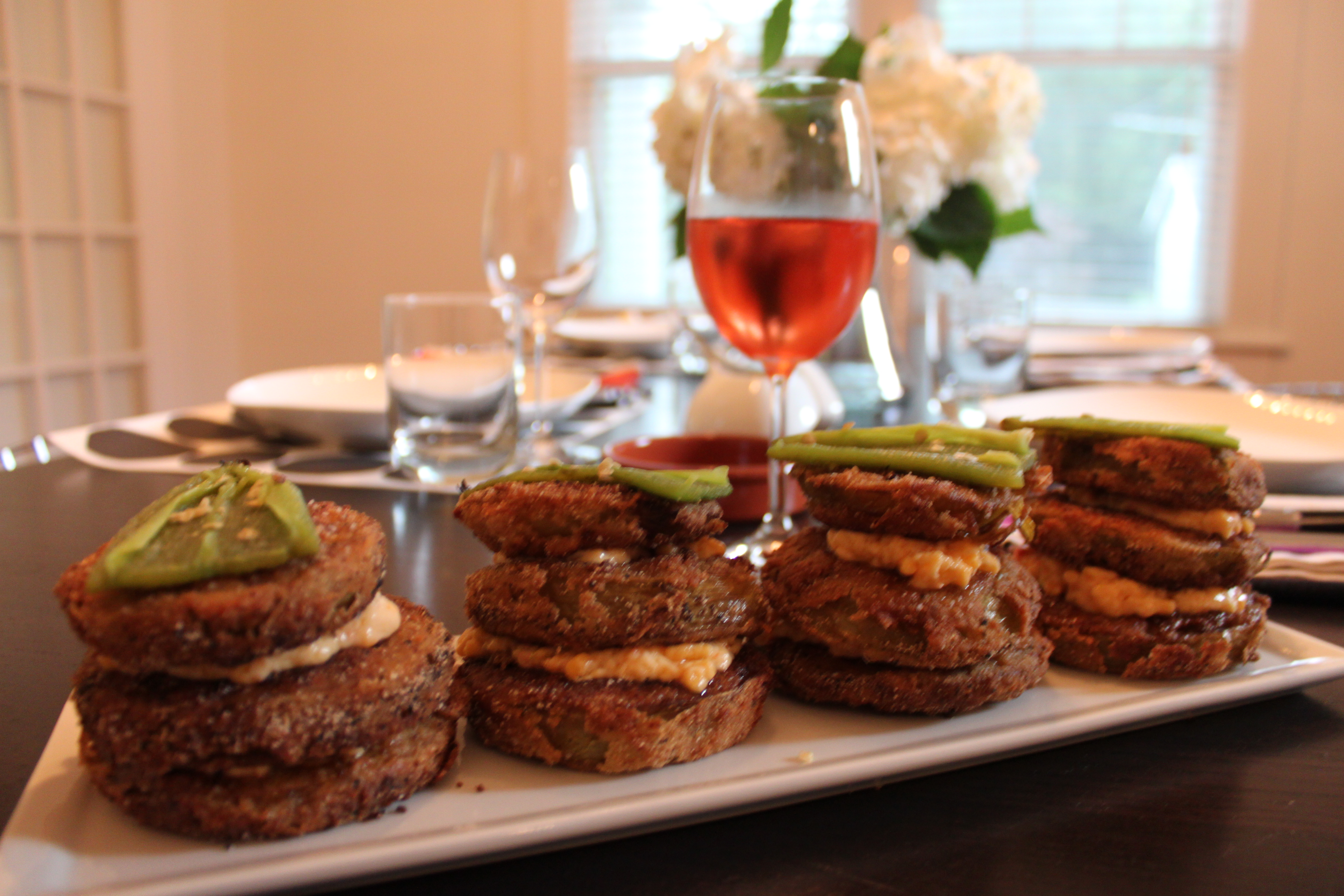 Fried green tomatoes are really only permitted once a year but are an amazing treat to surprise friends with. I use a simple recipe of buttermilk, eggs, cornmeal, flour and garlic powder. And fry in a mix of canola oil and butter. The recipe is from Garden & Gun Magazine but I scale back the frying proportions dramitcally for the sake of all mental and physical health. This recipe is incredible and worth all the mess. I served the green tomatoes stacked between a smear of pimento cheese and a sliver of super hot fire-roasted jalapenos (a big kick!). You could easily replace the jalapeno for fresh basil.