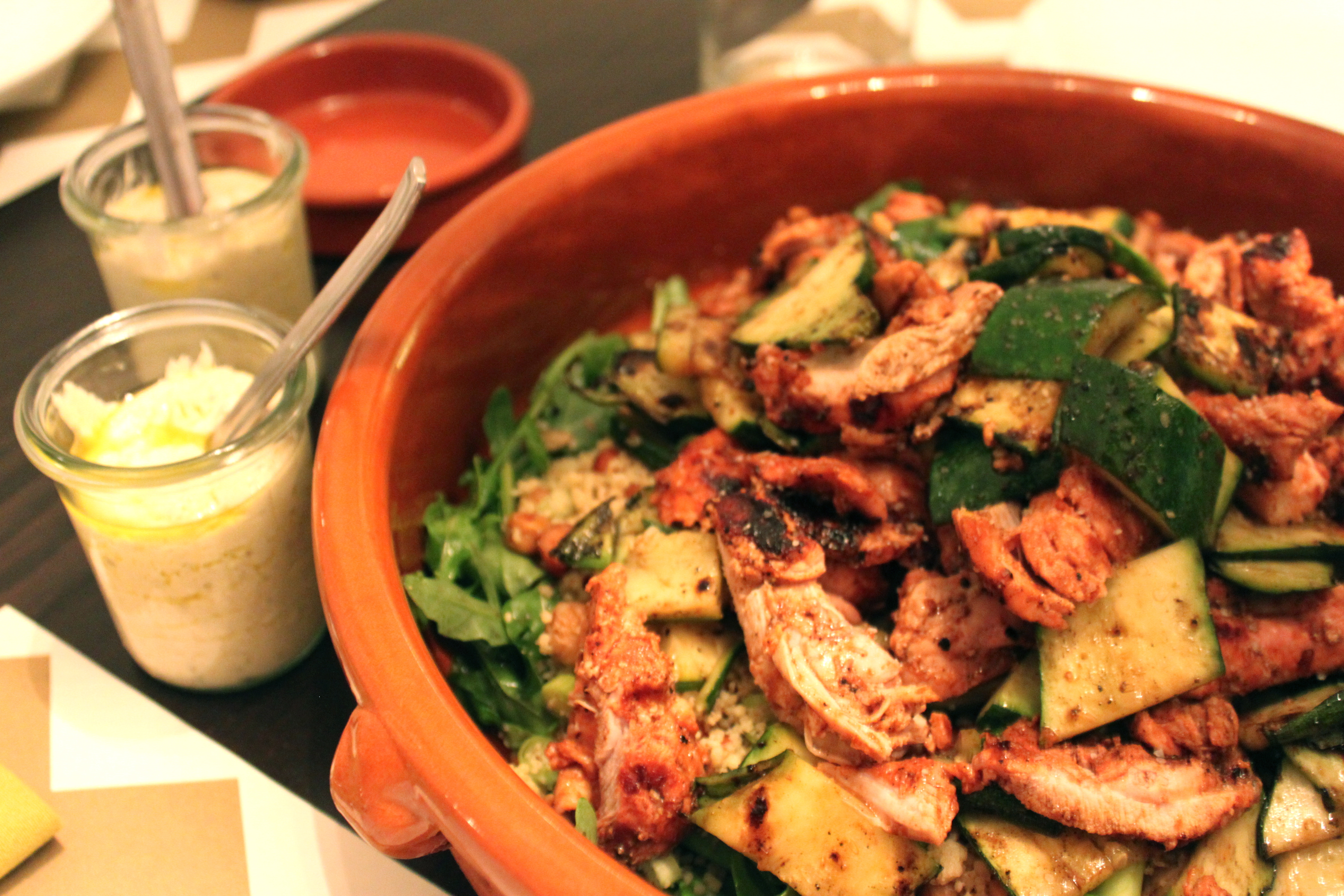 This salad is full of crunch, flavor and layers of delicious with a yogurt topping. The recipe for Nutty Couscous Salad with Grilled Chicken and Zucchini is from one of my favorite food blogs – What Katie Ate. It’s a bit time consuming to make but worth it for a nice evening with friends and lots of wine. Also, it’s a supper in one bowl including couscous, lots of protein from chicken, seeds and nuts, greens and grilled zucchini.