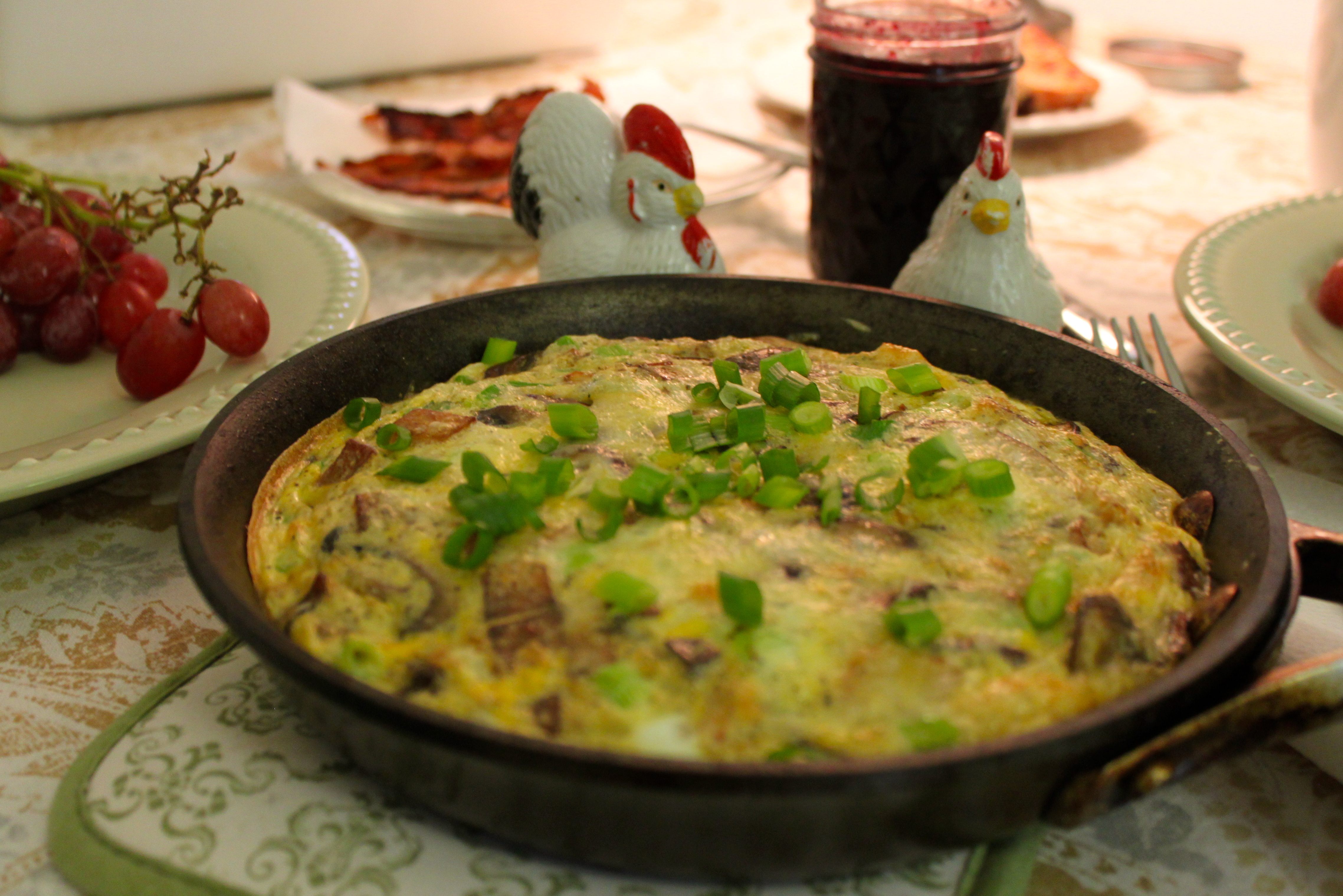 With the skillet on medium heat, add the egg mixture on top of the potatoes and mushrooms.  Allow the bottom to begin cooking for a moment then move the skillet into the oven. Cook until completely set and puffy (you’ll know when the eggs are cooked through). Remove and top with additional cheese and scallions. Serve hot (and maybe with some hot sauce!) !