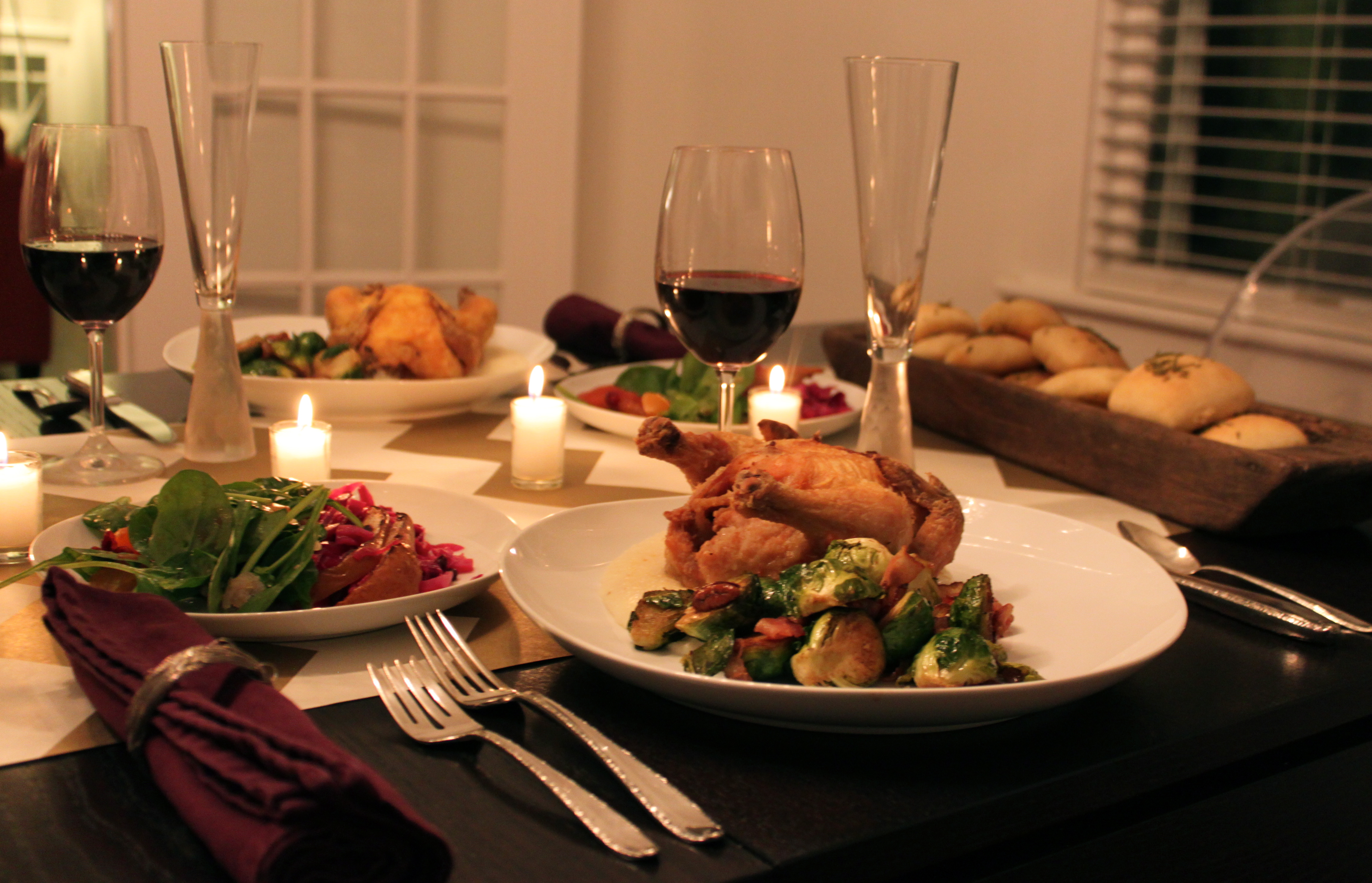 We think the key to this dish is the brining process. It adds extra flavor and moisture to the birds. It takes a little advance preparation but is totally worth the time. I recommend picking up any poultry brine mix and making it according to their directions. Frying is also a labor of love. It took longer than expected but was a great conversation piece in the kitchen with guests and allows extra time for drinking wine and catching up.