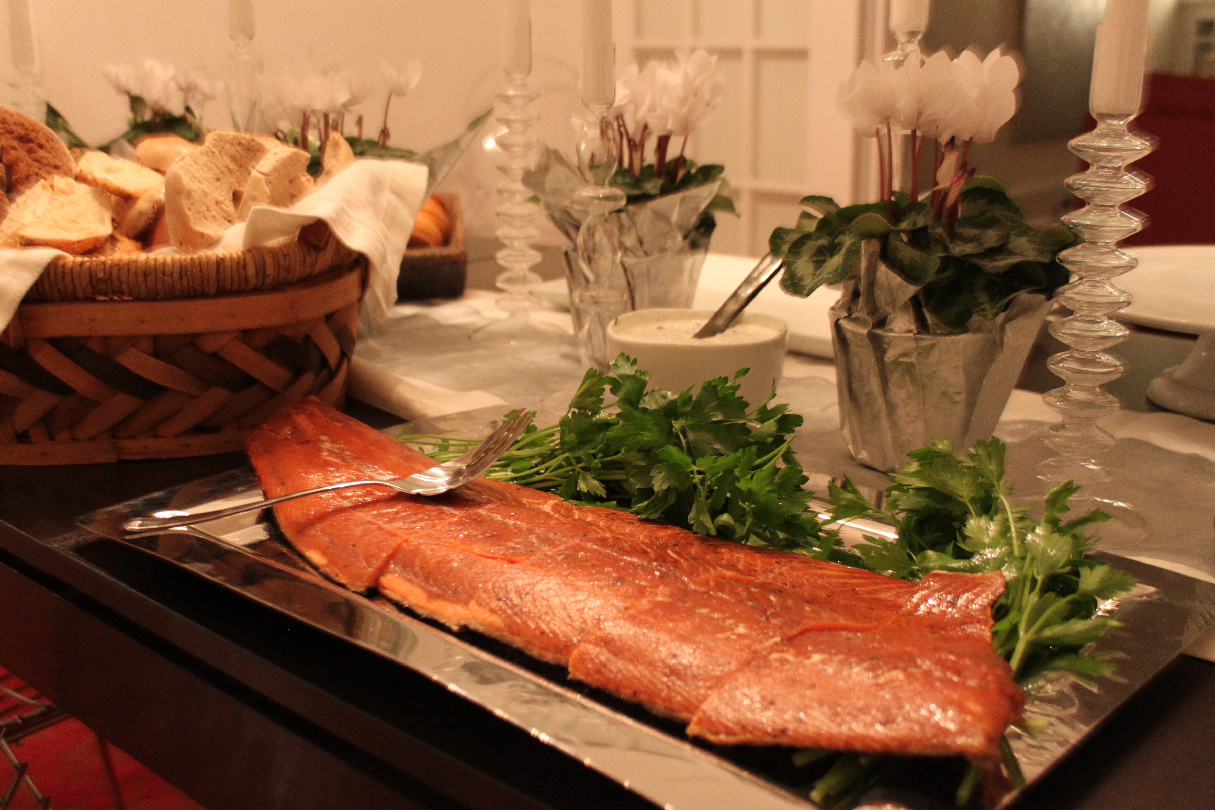 As I mentioned on Sunday, a the whole Cedar Smoked Salmon was a big hit of the party. Every last morsel of the fish was eaten. While this is a great – and fantastically easy – idea for a big party, it is also delicious for a small gathering or for snacks throughout the week. You can purchase a small piece or a whole fish from The Fresh Market fish counter.