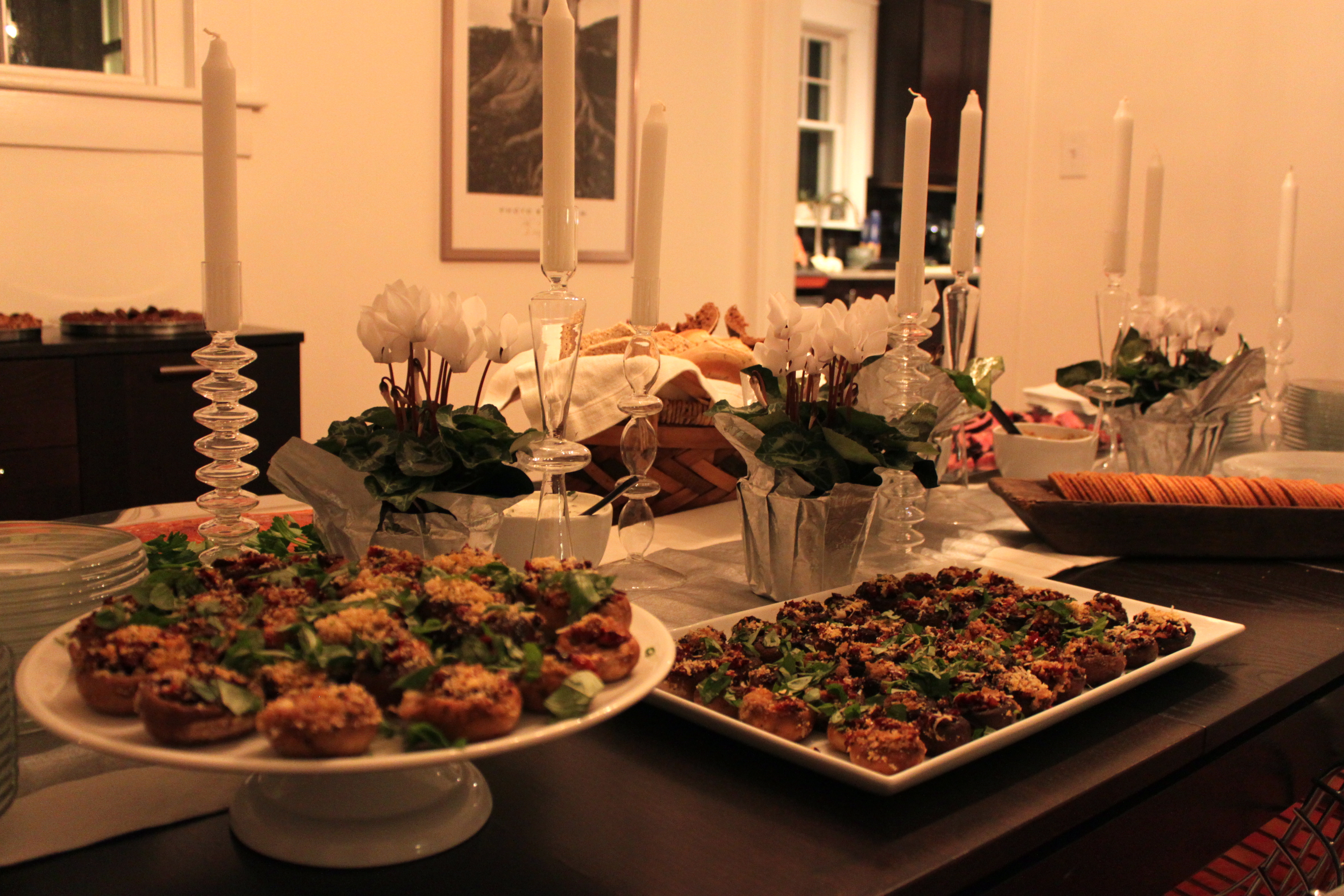 In order to have enough options for my vegetarian friends, I decided to both sun-dried tomato stuffed mushrooms and a nice cheesy artichoke dip. These mushrooms were very easy to make ahead and baked right before guests arrived. Along with the rest of the food – they disappeared before midnight. And I have a feeling the meat-eaters loved them too.