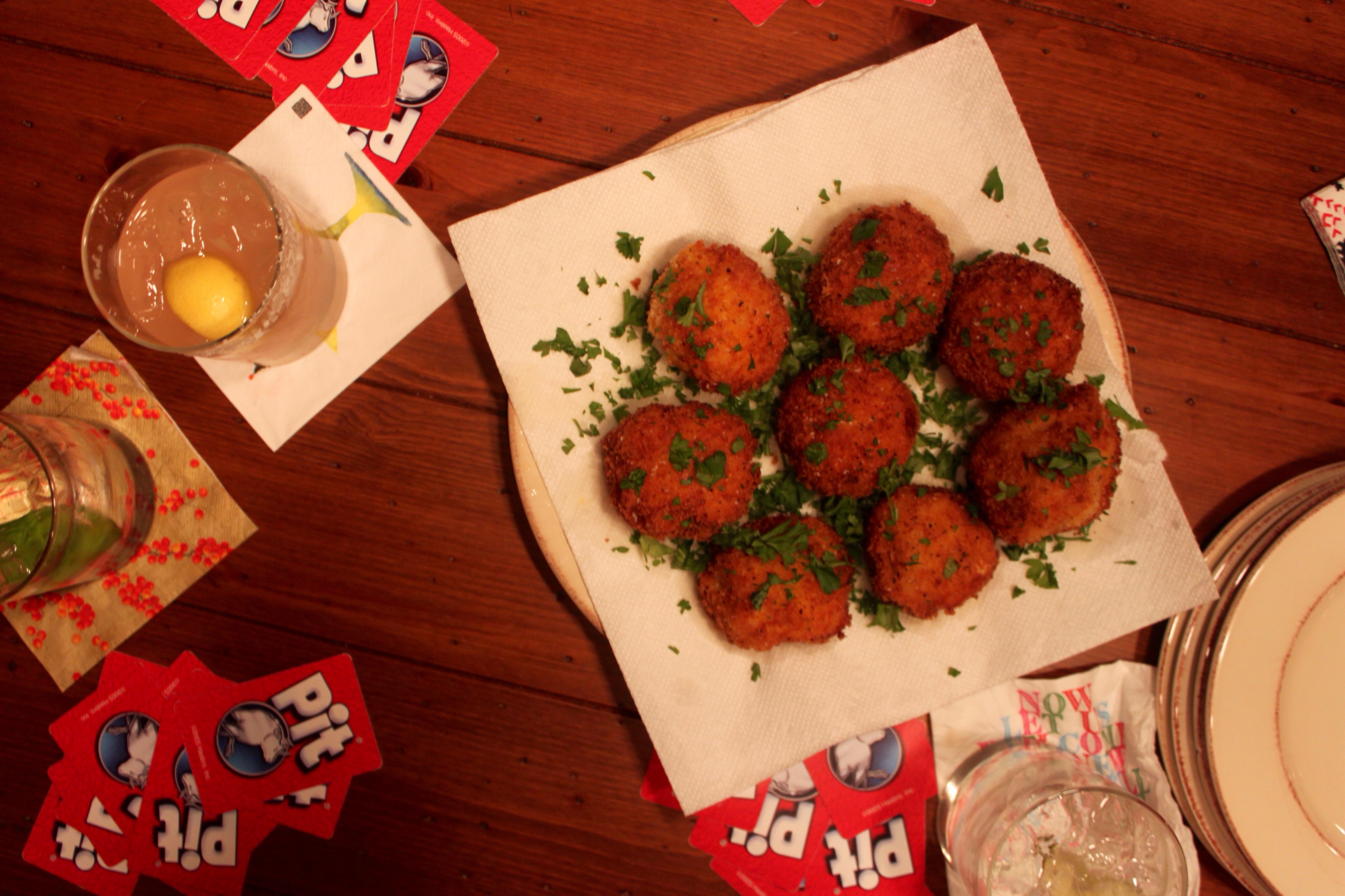 I must admit, we made way too much food. Yet it was all adventure in the kitchen with tasty results. in the midsts of a heated card game, I served hot fried risotto balls. This recipe was a total test but turned out great. The key is buying frozen risotto from the store. The Fresh Market has two great varieties that are perfect for this use. Skipping the making of the risotto is the only way to do it.