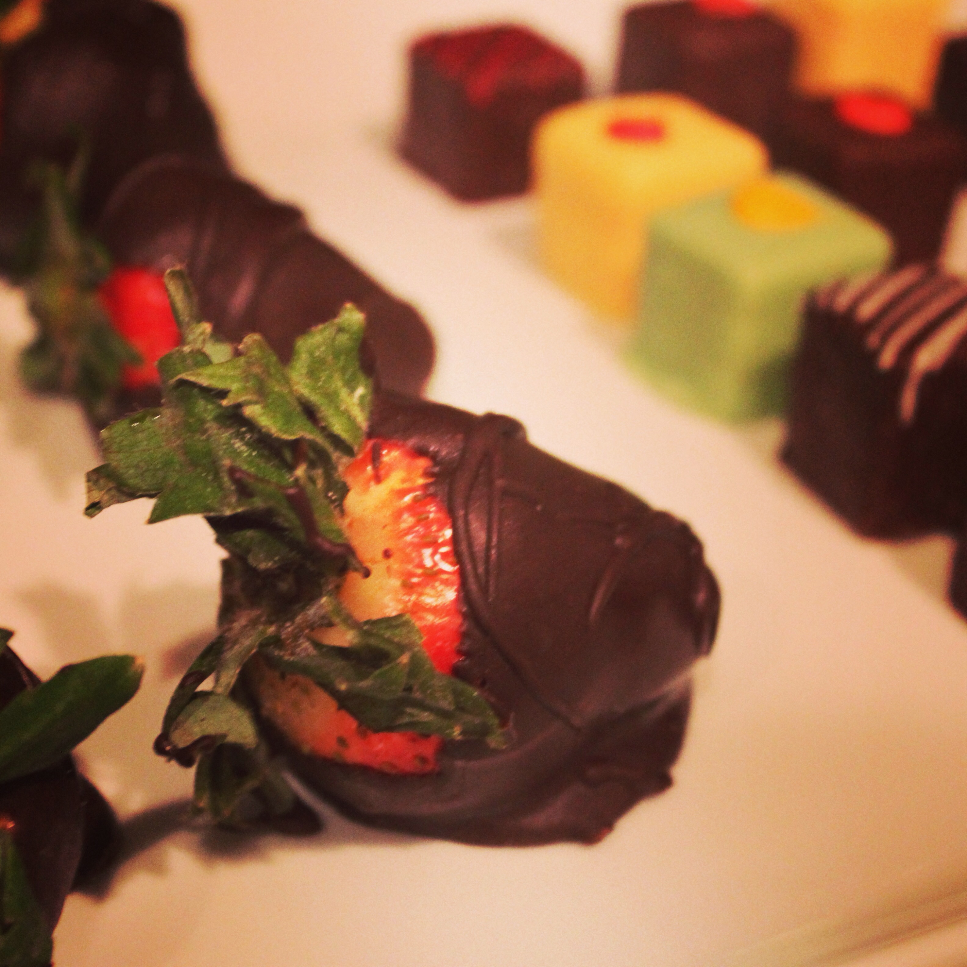 I picked up a variety of chocolate covered strawberries and petit fours from The Fresh Market dessert counter. They were elegant and decedent and a perfect late night spread. It also proves that you don’t need a romantic date to appreciate these little elegant desserts!