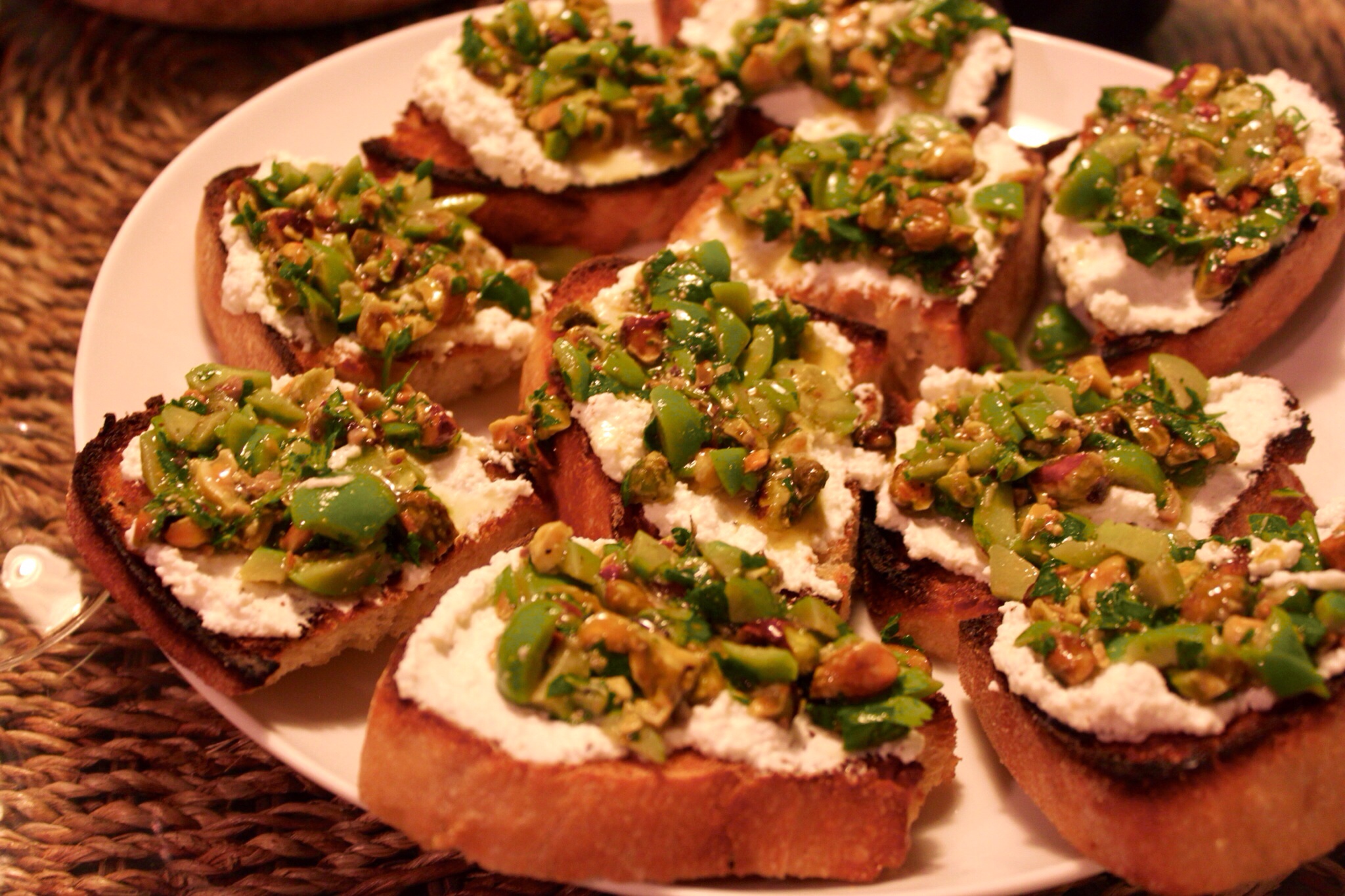 Crostini with Ricotta, Olive and Pistachio