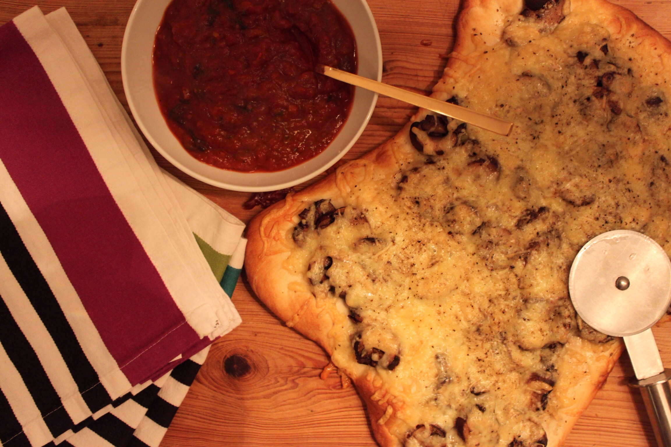 Remove from oven; prick any large bubbles with a fork and flatten. Scatter mushrooms over crust, then season with salt and pepper and lay cheese on top.