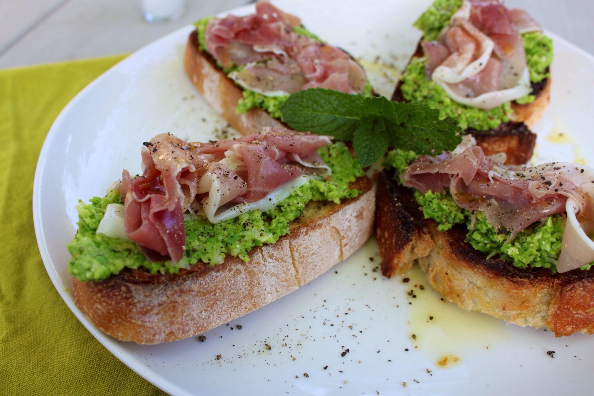 Slice the bread into thick pieces. Drizzle with olive oil, salt and pepper. Broil until toasted. Top with pea mixture, a slice of prosciutto and more pepper. And, a splash of lemon olive oil, if you have it.