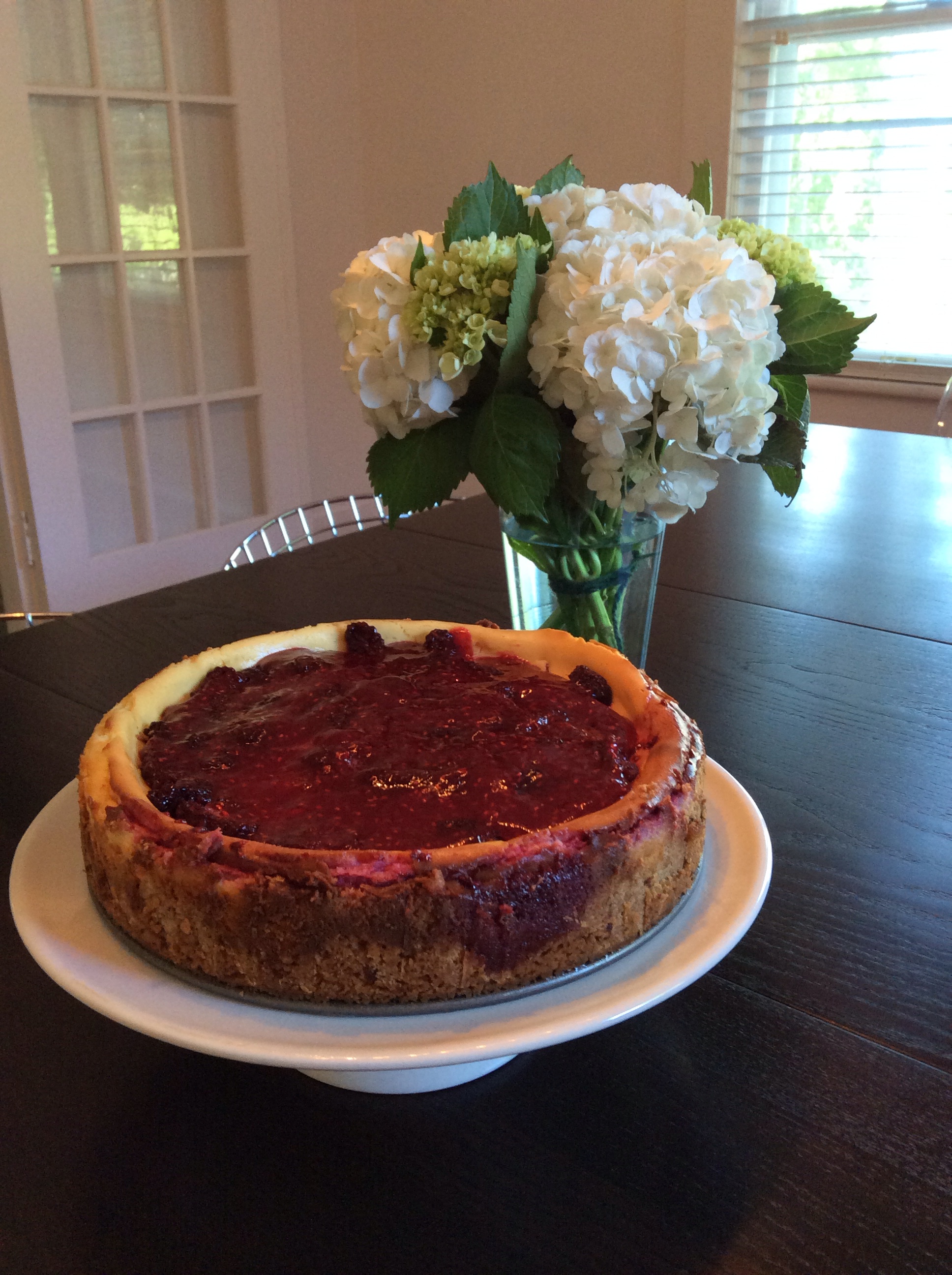 The last couple of weeks, I’ve had some serious challenges with baking. I tend not to have the necessary patience for measuring. I’m always cutting a few corners or rushing the baking process. It works with some things in life but certainly not all! Cheesecakes tend to have a little more room for error, so I chose the Pioneer Woman’s Blackberry Cheesecake for my party dessert this past weekend. It’s berry season, so you could just whatever your favorite is.