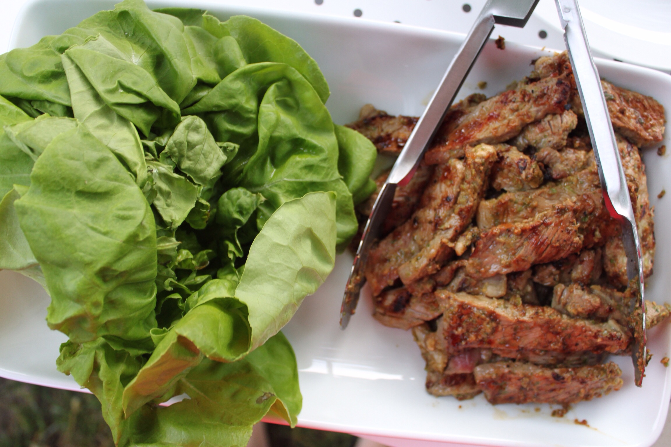 Make a marinade by blending together the first six ingredients. Slice the steak and marinate for just two hours. Using a hot grill, grill slices very quickly to sear the beef but not over cook. Serve in lettuce leaves with siracha!