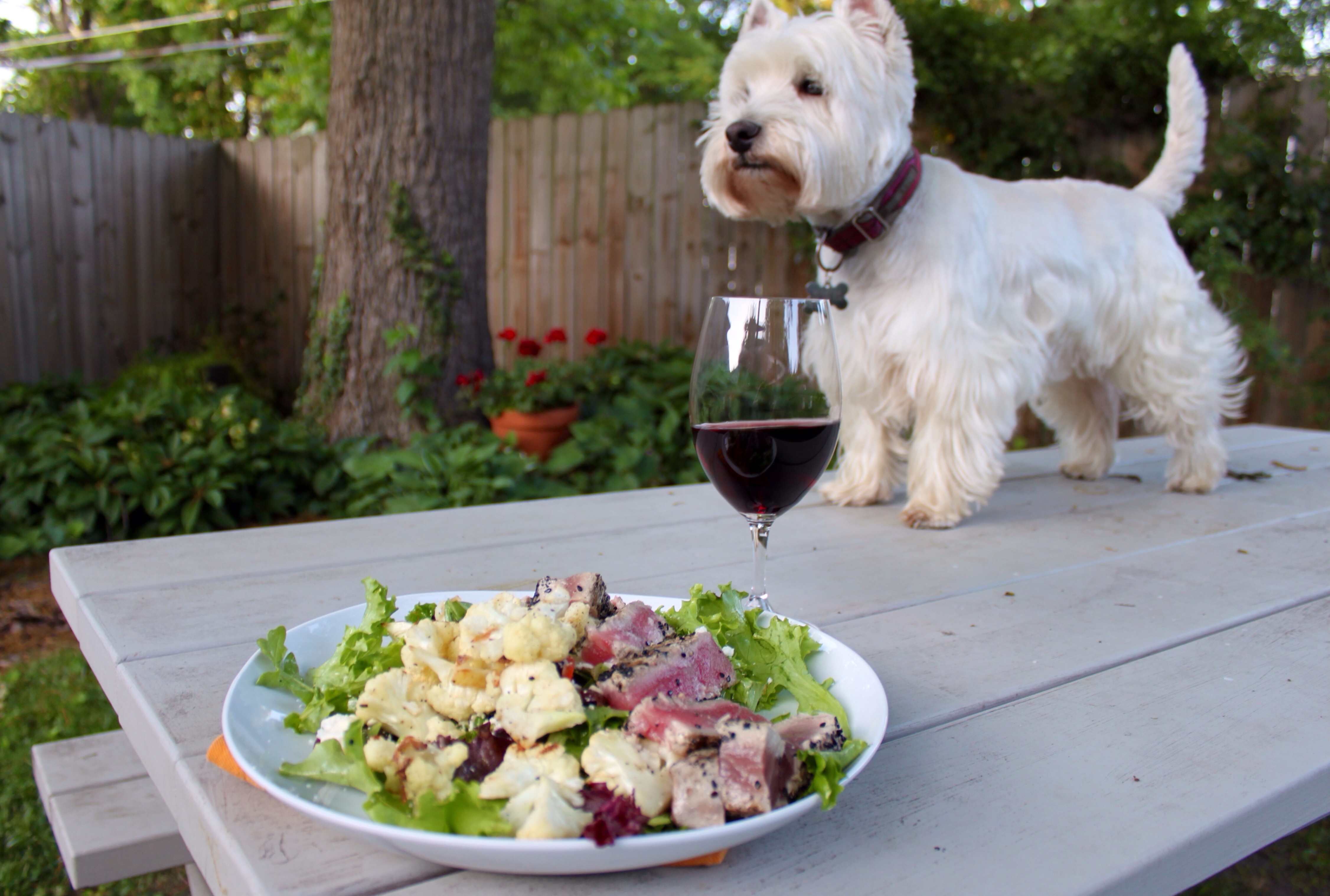 Just another manic Monday. My summer has been packed with projects and I can’t seem to make more than 15 minute meals on a week night. And I’m not talking about the kinds on TV that involve weekend prep, freezing and crockpots. My 15 meals mostly look like the above – a salad combination of greens, items from the olive bar, roasted cauliflower or broccoli and a piece of grilled fish. All in all, pretty healthy and sophisticated for a Monday night after a long day and a trip to the gym. I highly recommend getting creative. It makes busy living seem much more like ‘easy living.’