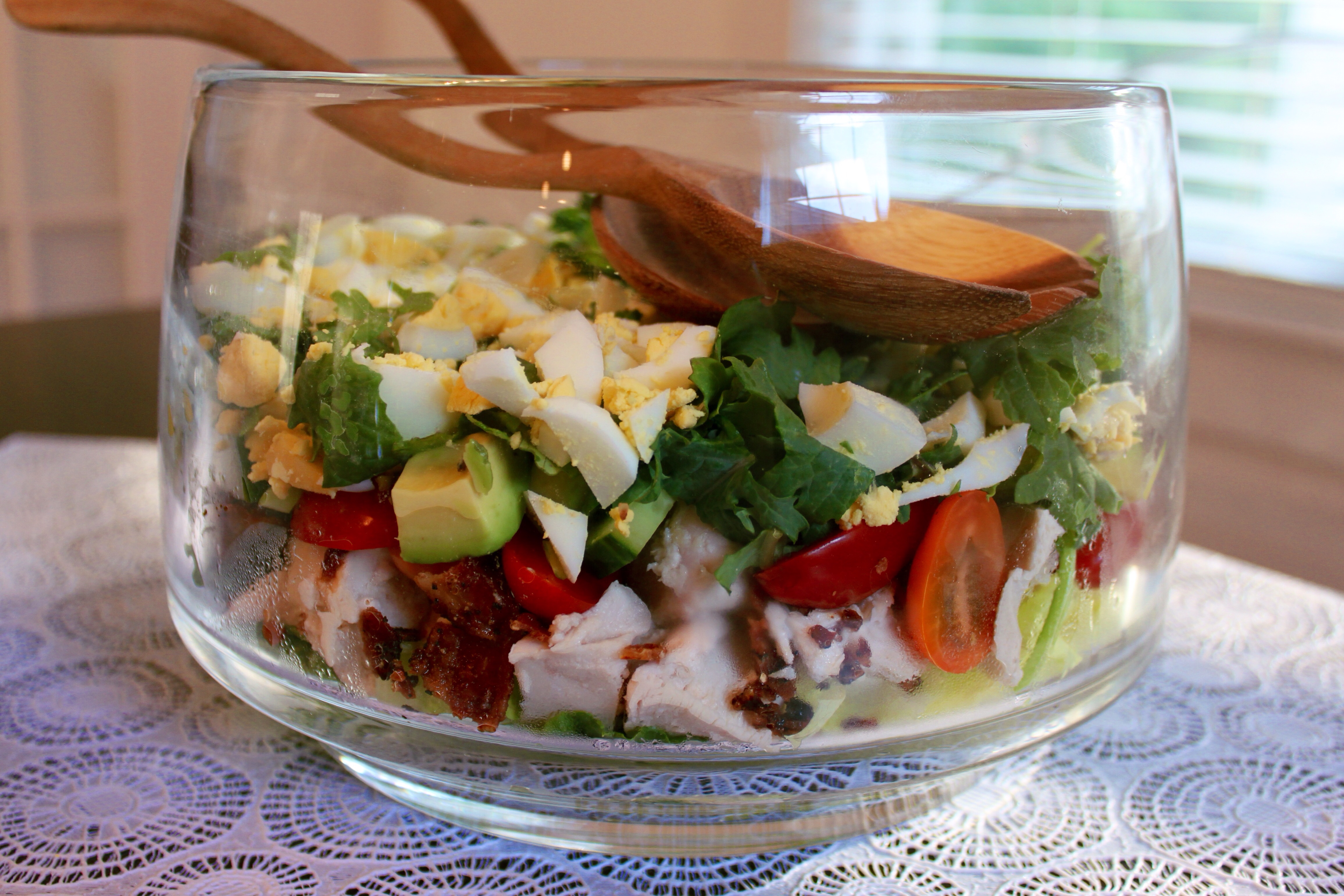 Layer the salad in a large bowl (I love the glass to show the layers). Romaine lettuce, chicken, bacon, tomatoes, cucumbers, scallions, avocado, greens, egg and cheese! Dress with your favorite dressing.