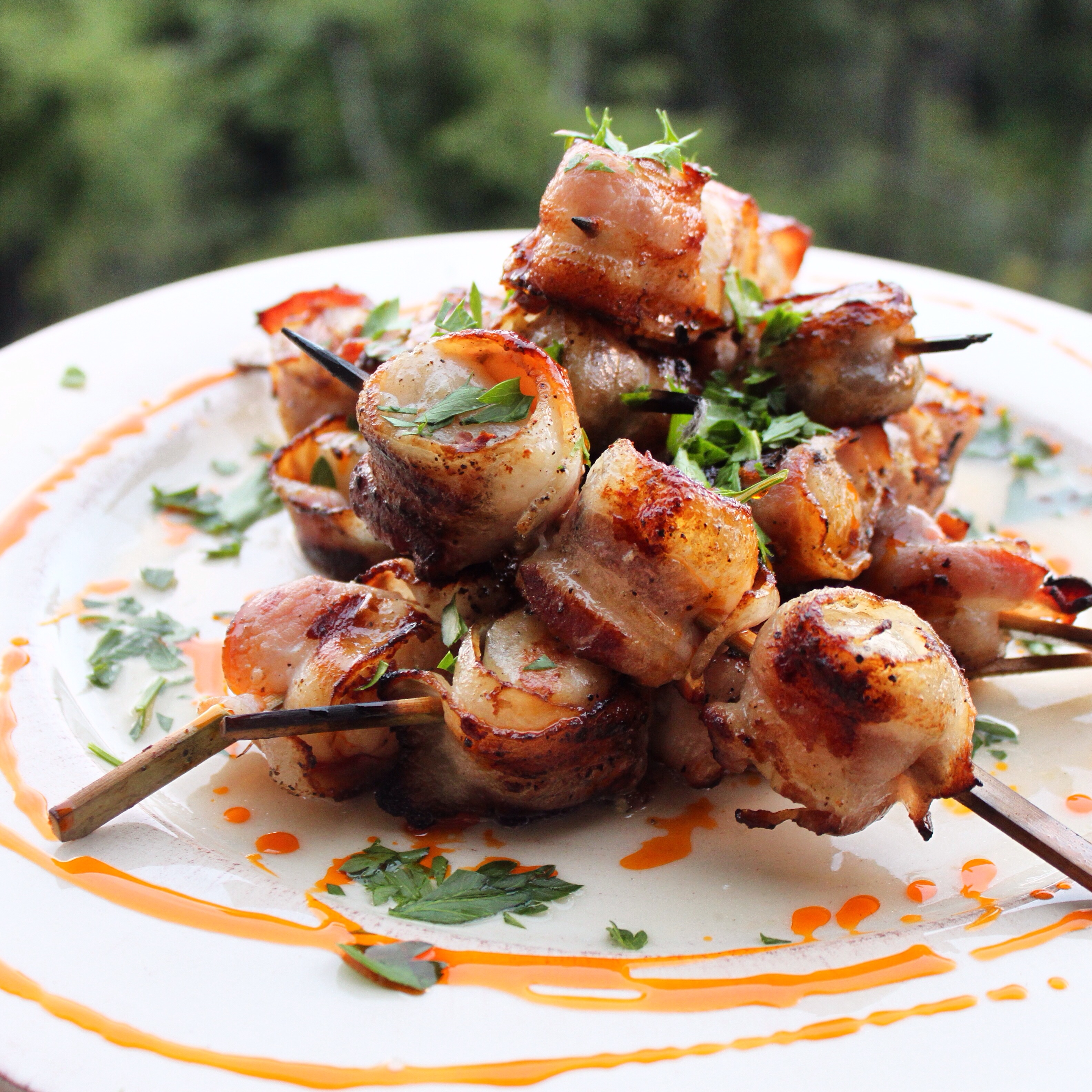 The first night we enjoyed gin and tonics with grilled bacon wrapped scallops drizzled with cayenne pepper. After the drive up, this appetizer couldn’t have been easier. Here’s the tip: The Fresh Market sells the skewers pre-made! You don’t have to soak the wooden skewers, deal with the wrapping or the skewering. Just grill, brush with a little butter and garnish with cayenne oil and a little chopped parsley. Looks pretty fancy, right?
