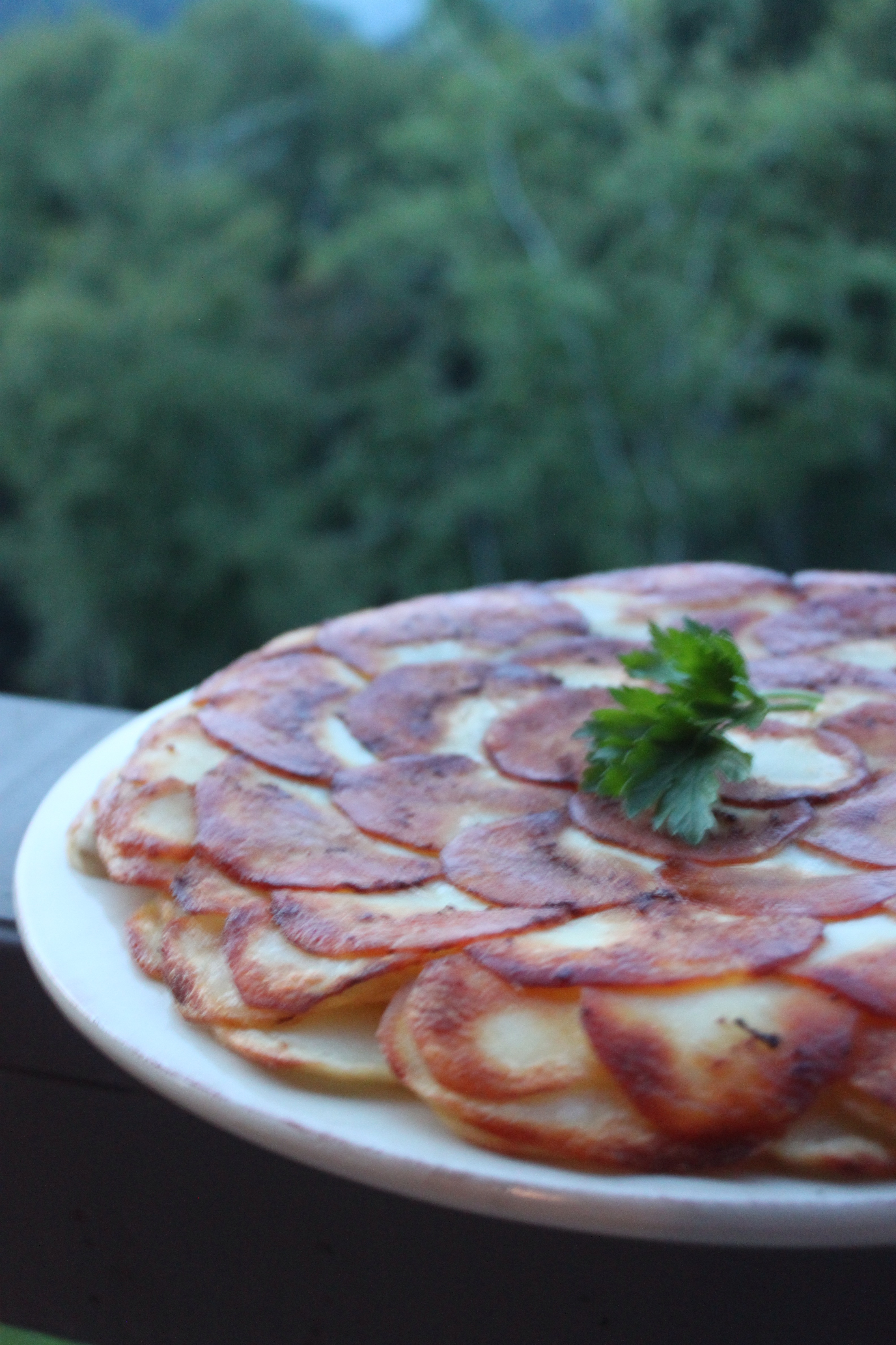 Growing up, we always made pommes anna together as a family for special occasions. We had them for birthdays and graduations, all sorts of milestones. I still reserve this dish for these types of celebrations. So I decided to serve Pommes Anna – with an even fancier twist – for a housewarming of sorts at my friend’s Jamey and Phil’s new mountain condo. It was also a fun group activity peeling potatoes, slicing with a mandolin and arranging layers. I put the hardest part of the dish on Phil – flipping the pan before serving.