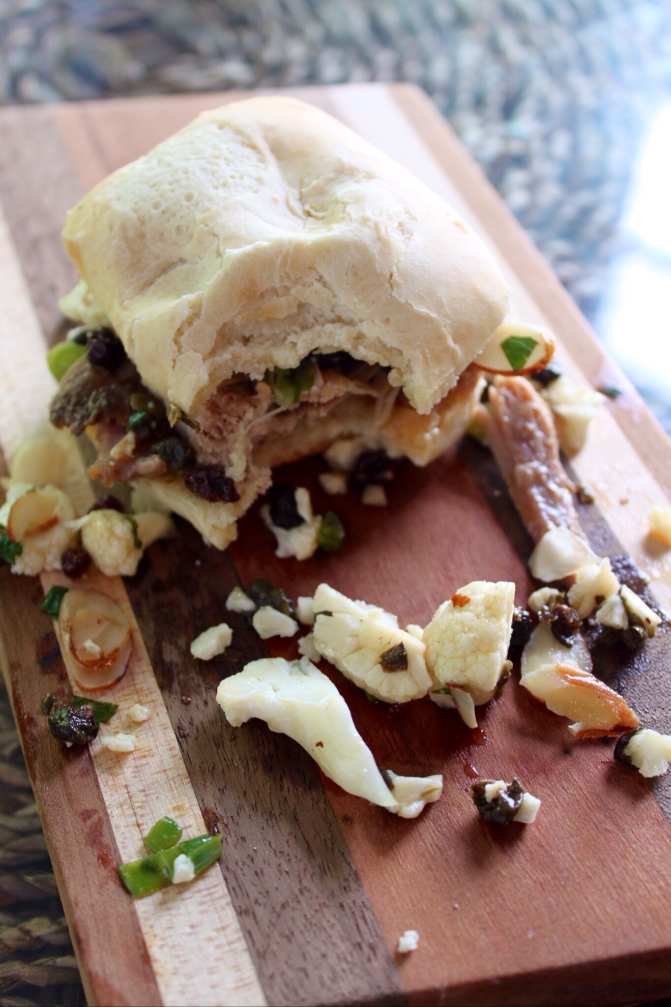 Scoop currants from vinegar mixture with a slotted spoon and add to bowl with cauliflower, along with almonds, capers, scallions and parsley. Slowly whisk 5 tablespoons olive oil into remaining vinegar mixture in a thin stream. Add several turns of freshly ground black pepper. Pour over cauliflower and other ingredients and turn gently to coat all pieces. Taste and adjust seasonings, adding more lemon juice, salt or pepper to taste. Dig in!