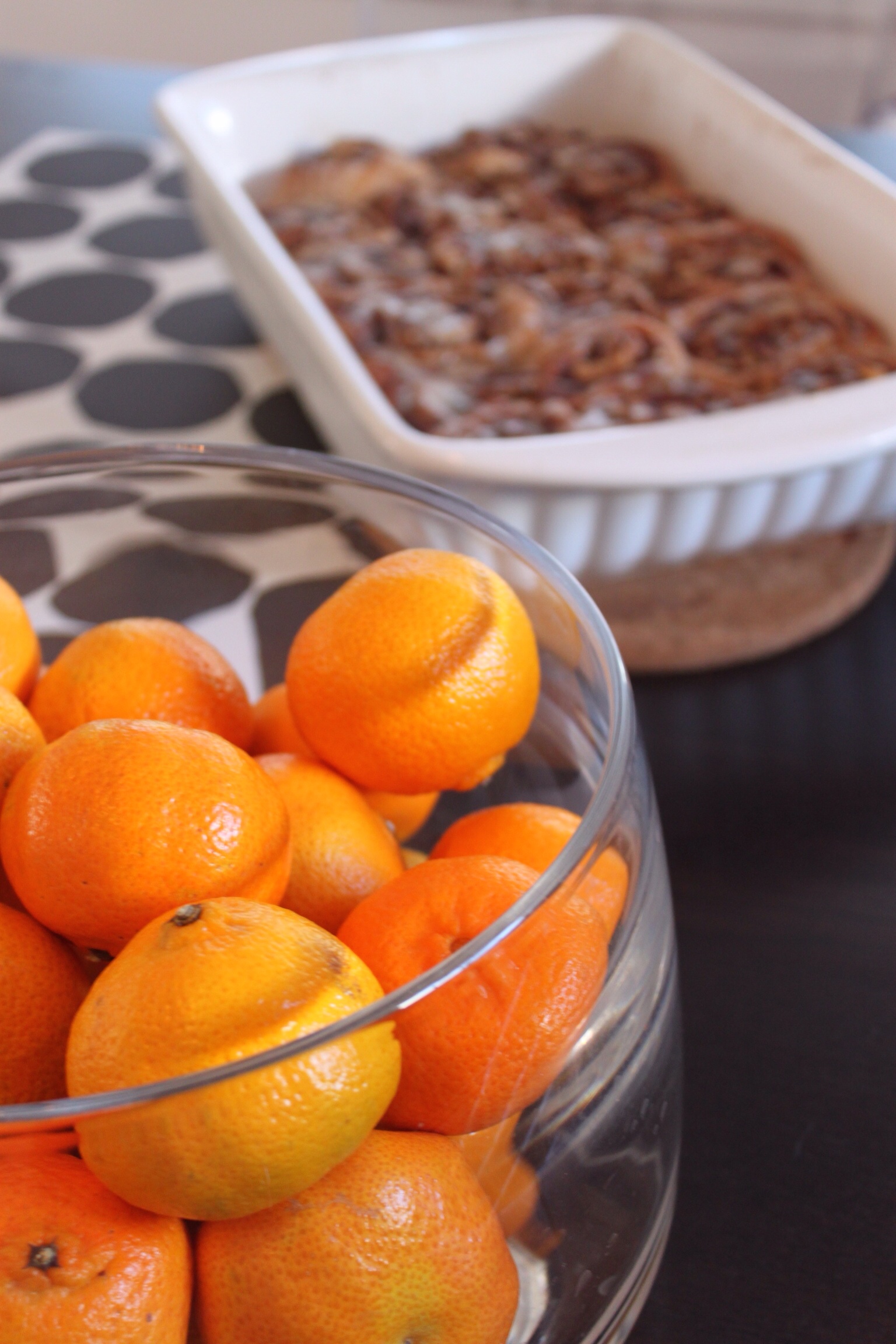 I love a sweet roll because you can make them the day before. Wake up early for a final rise while enjoying a cup of coffee and then bake off right before guests arrive (or wake up). I made these homemade cinnamon rolls for my Winter Walk friends this past Sunday. They were a huge hit and renamed “homemade cinnibon’ during the party. I baked them in a large casserole dish but you can use two cake pans easily. Save these for Christmas or New Year’s morning – it’s worth the wait.