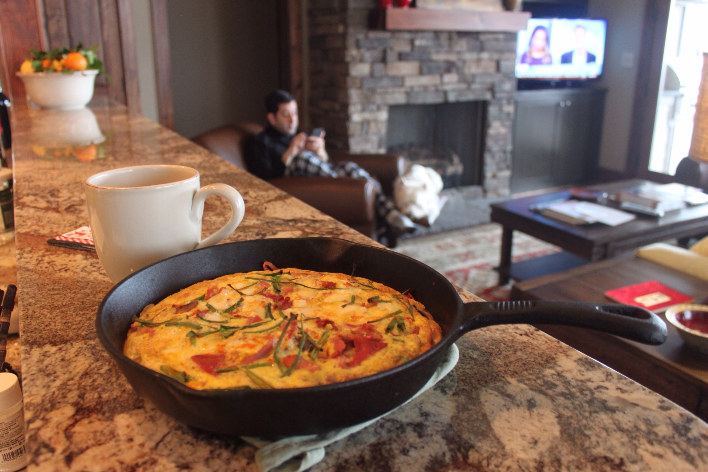 After the items have been added, place the skillet in the oven and cook until puffy and brown. Serve hot. Enjoy by the fire, with mountain views, good friends and fuzzy slippers (optional too).
