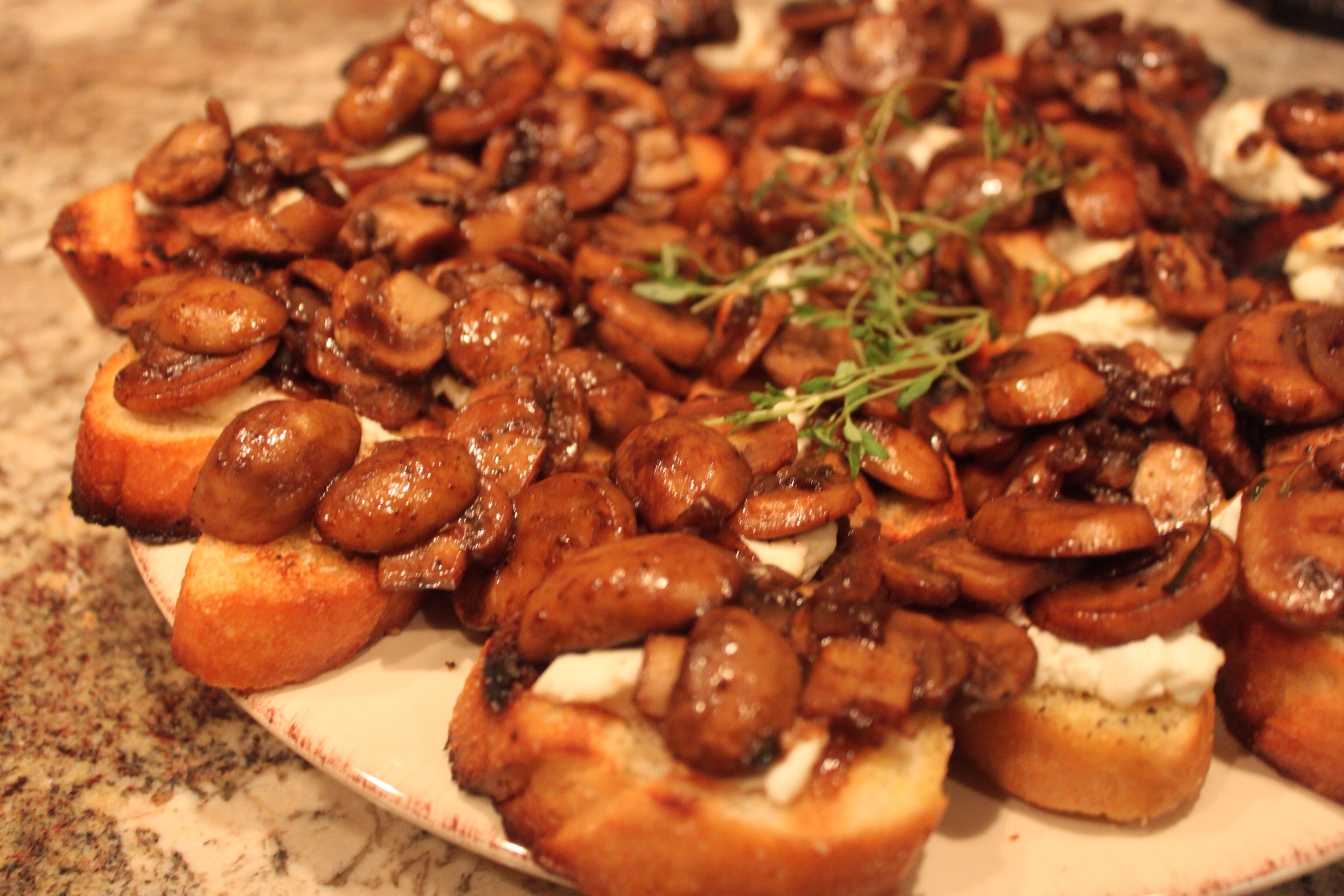 - Spread some of the goat cheese on each crostini. Bake about 8 minutes or until cheese is warmed through. Remove from oven. Top each with some of the mushroom-shallot mixture. Drizzle any remaining cooking liquid over crostini. If you like, sprinkle each with parsley. Serve immediately. Makes 30 crostini.