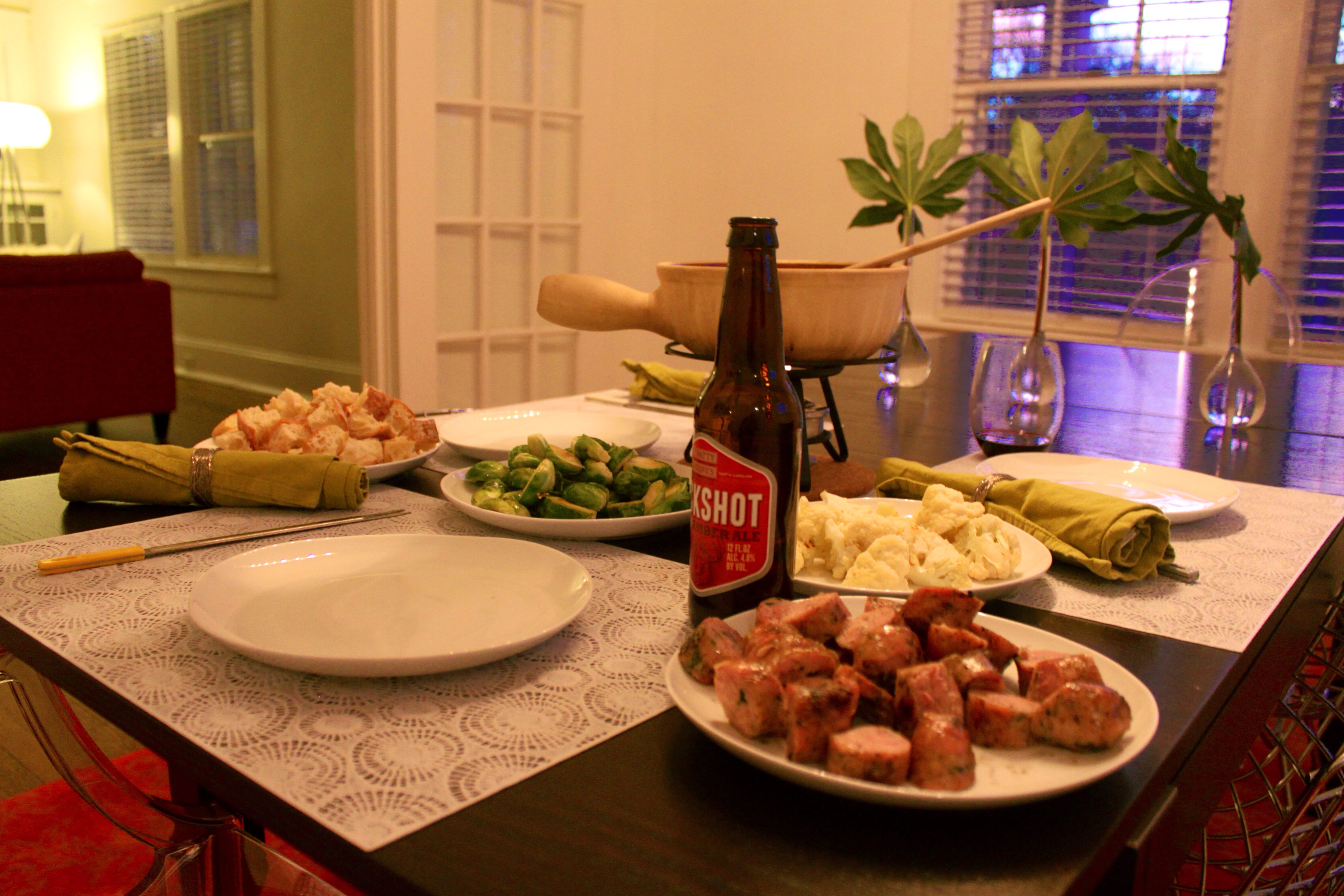 I served the fondue with slightly roasted crispy brussels sprouts, roasted cauliflower, chewy bread and grilled chicken sausages. But, you can certainly get creative.