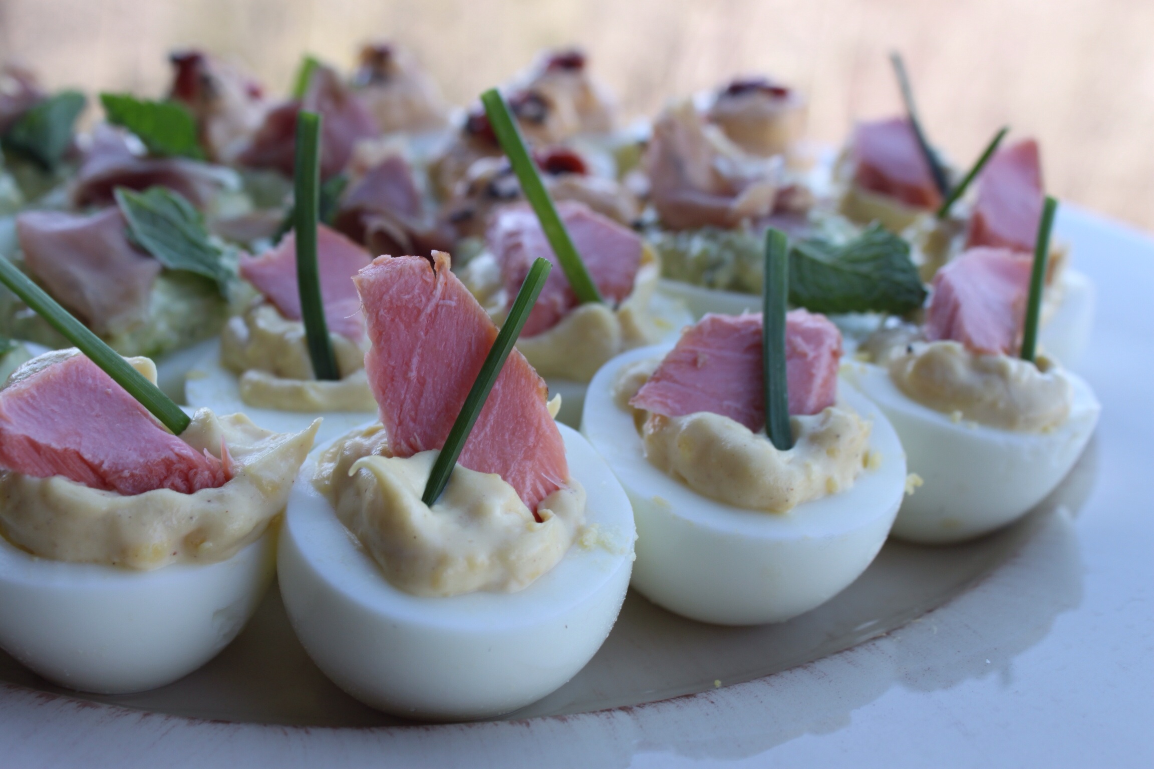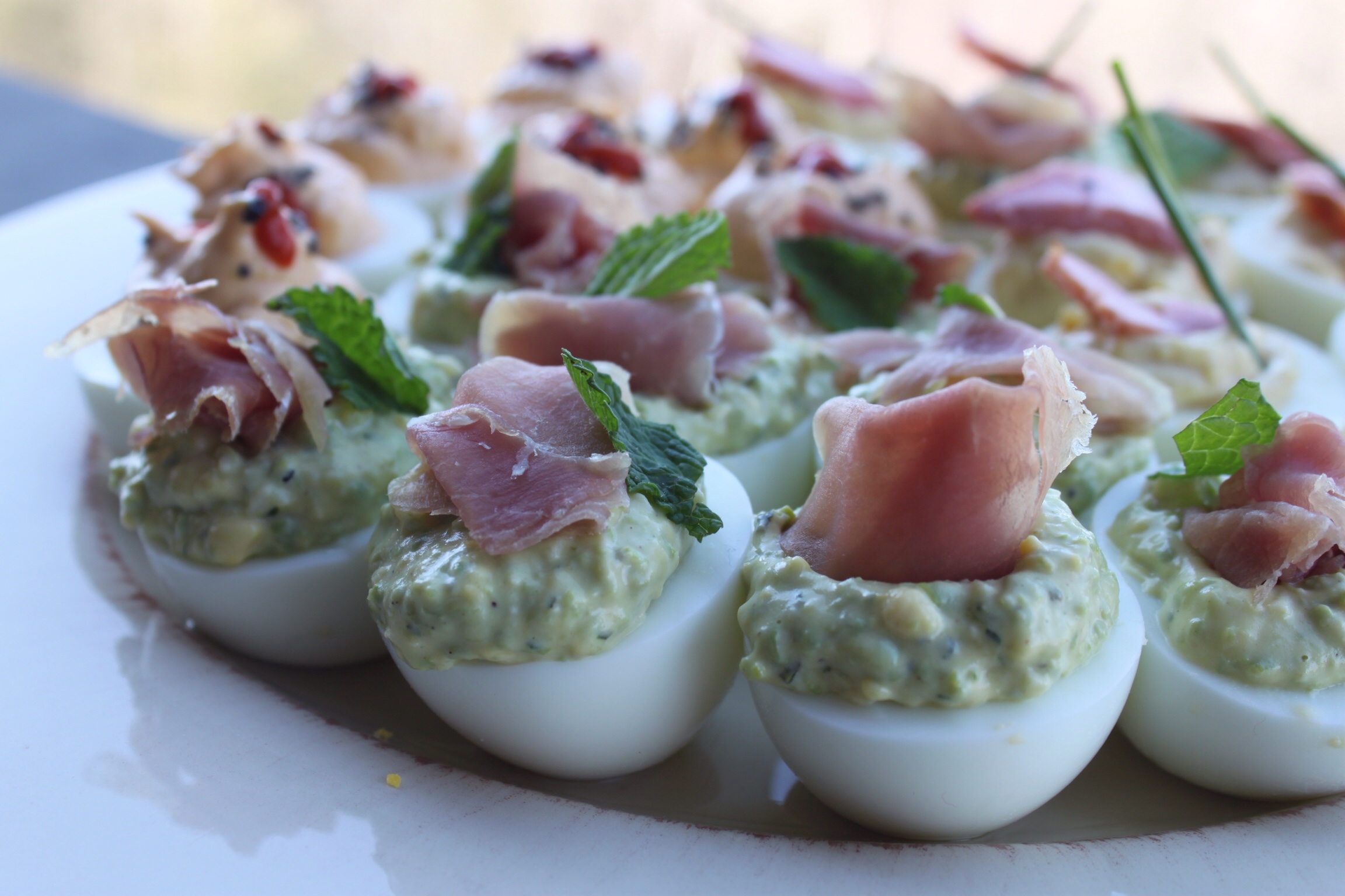Pea & Prosciutto – mix in 1/3 yolk mixture with a cup of Sweet Pea Topping. Top with a small piece of prosciutto.