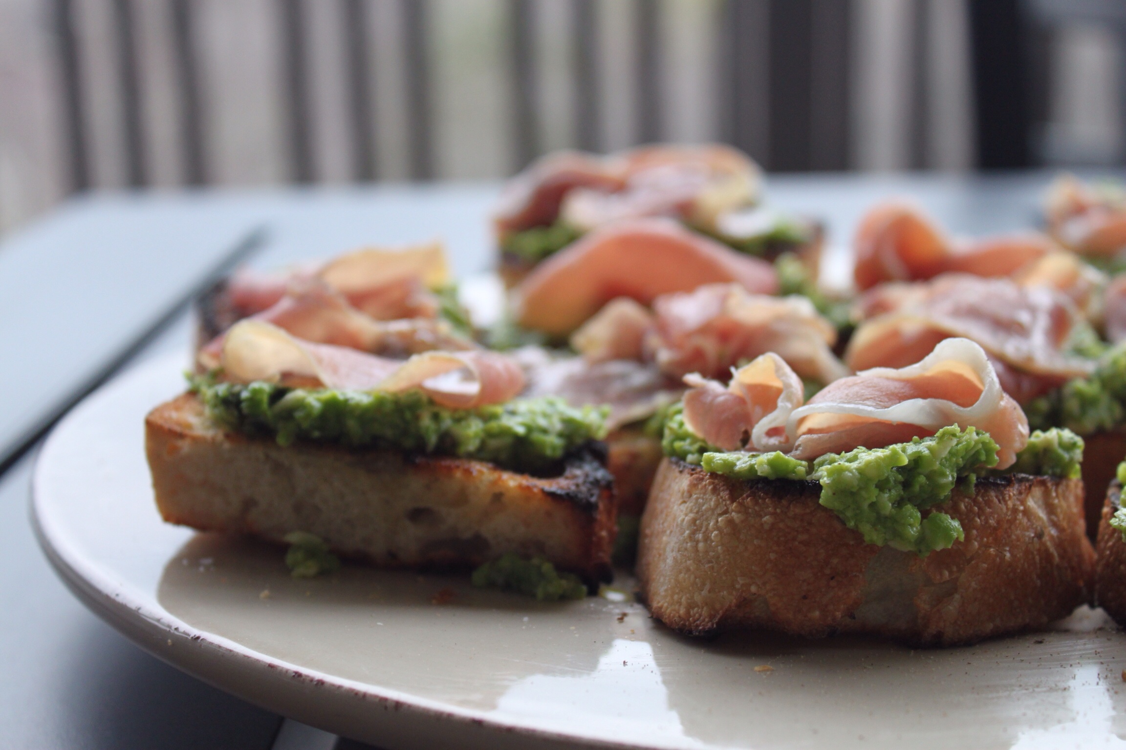 Slice the bread into thick pieces. Drizzle with olive oil, salt and pepper. Broil until toasted. Top with pea mixture, a slice of prosciutto and more pepper. And, a splash of lemon olive oil, if you have it.