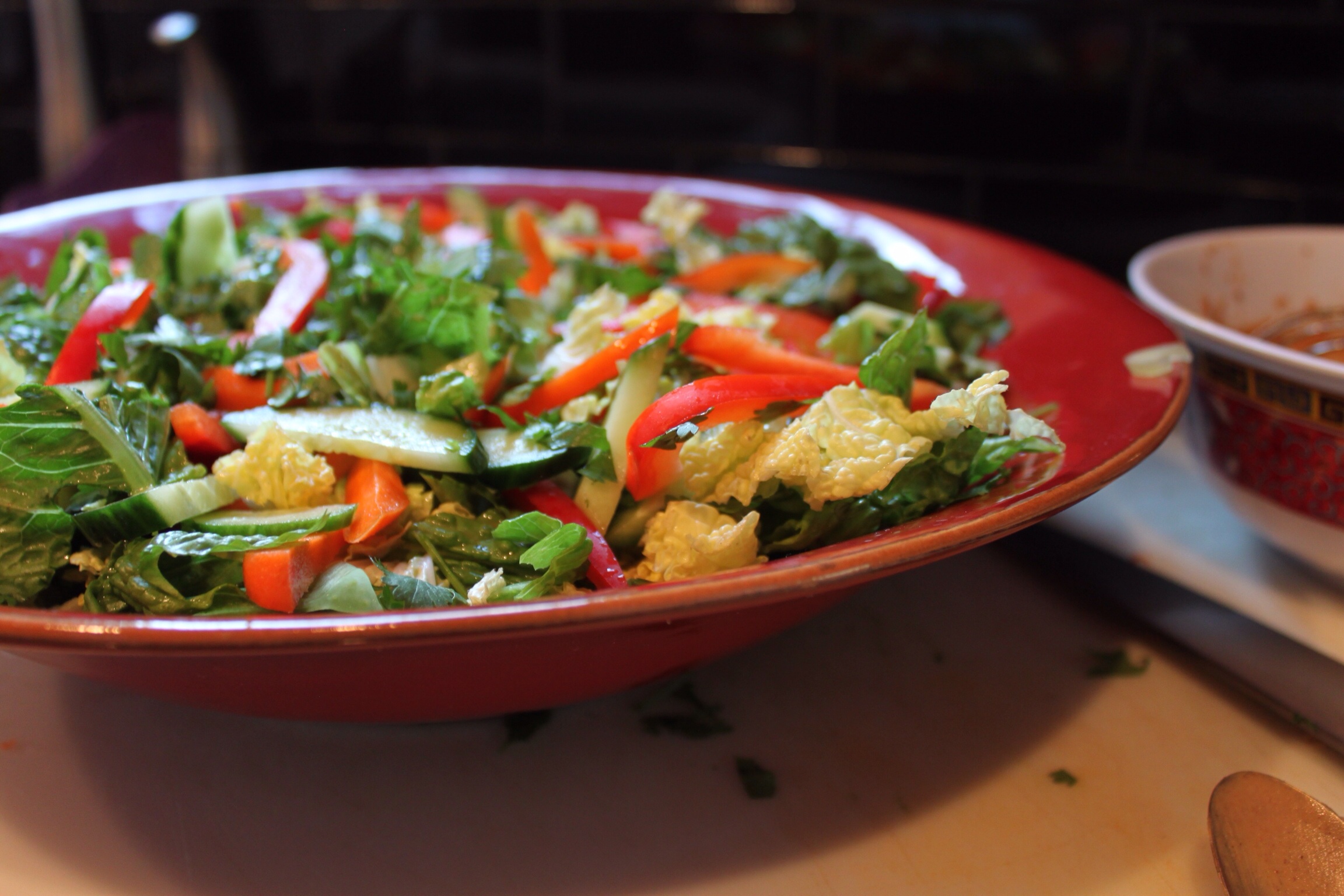 This weekend I convinced myself (with much encouragement from my mother) to complete the gaps in my lawn with sod. I don’t recommend this act solo, however, it comes with much self accomplishment once complete (my mom was right, as always). So, when the lawn was filled with lush grass around my new brick walkway, I decided it was only appropriate for have friends over for a dinner in the garden. I bragged about the dirty duty until the rain came… crushing the dream of my garden party. Instead, we enjoyed this super easy Grilled Chicken Chopped Thai Salad with a nice bottle of rose wine inside listening to the rain fall….nourishing my new sod. Winston, my pup, managed to say clean during all the sandy sod moving and muddy rain fall.