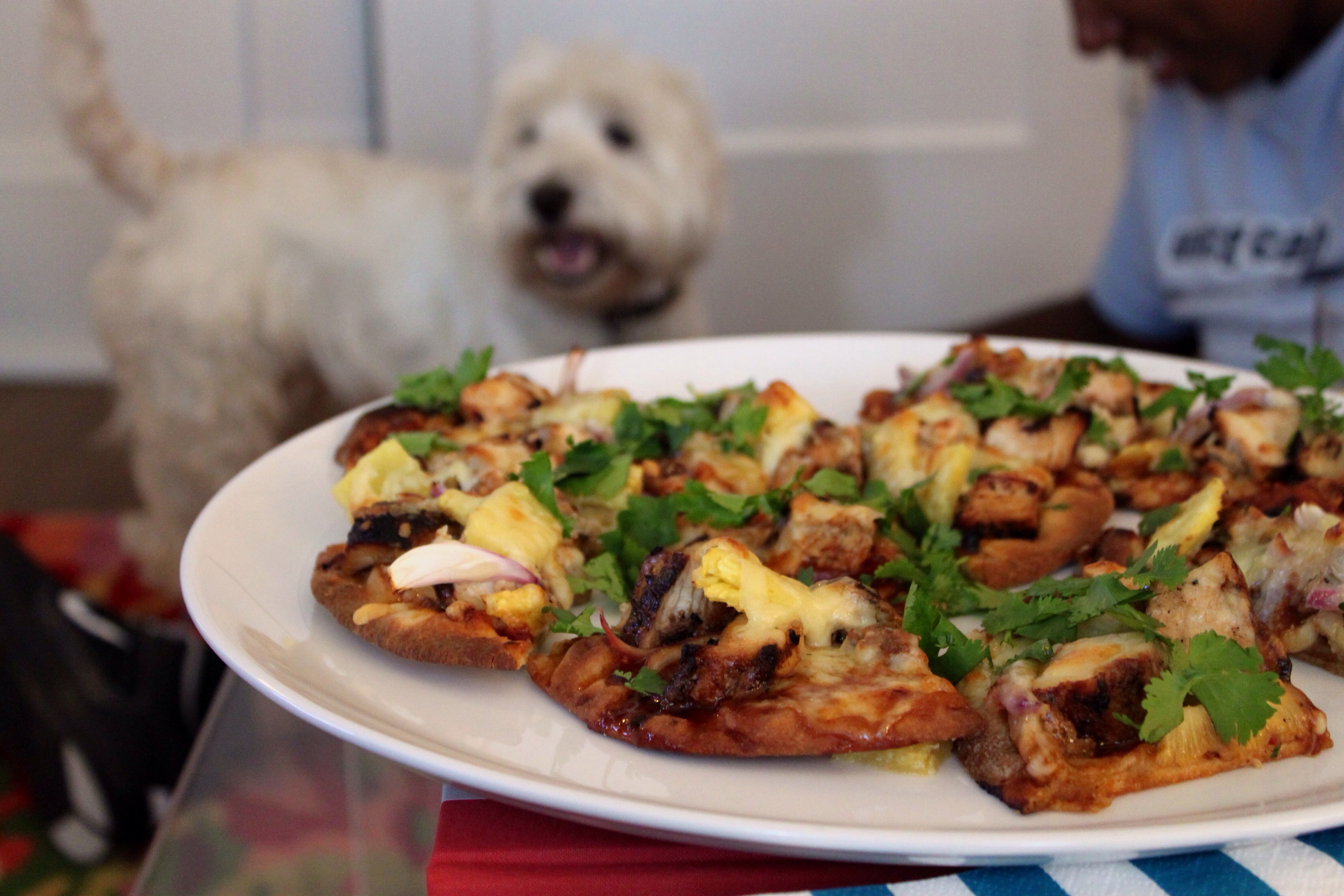 Spoon a couple of tablespoons of extra BBQ sauce on Naan bread evenly. Sprinkle on diced grilled chicken, thinly sliced red onion and pineapple. Top with shredded cheese (to your liking).