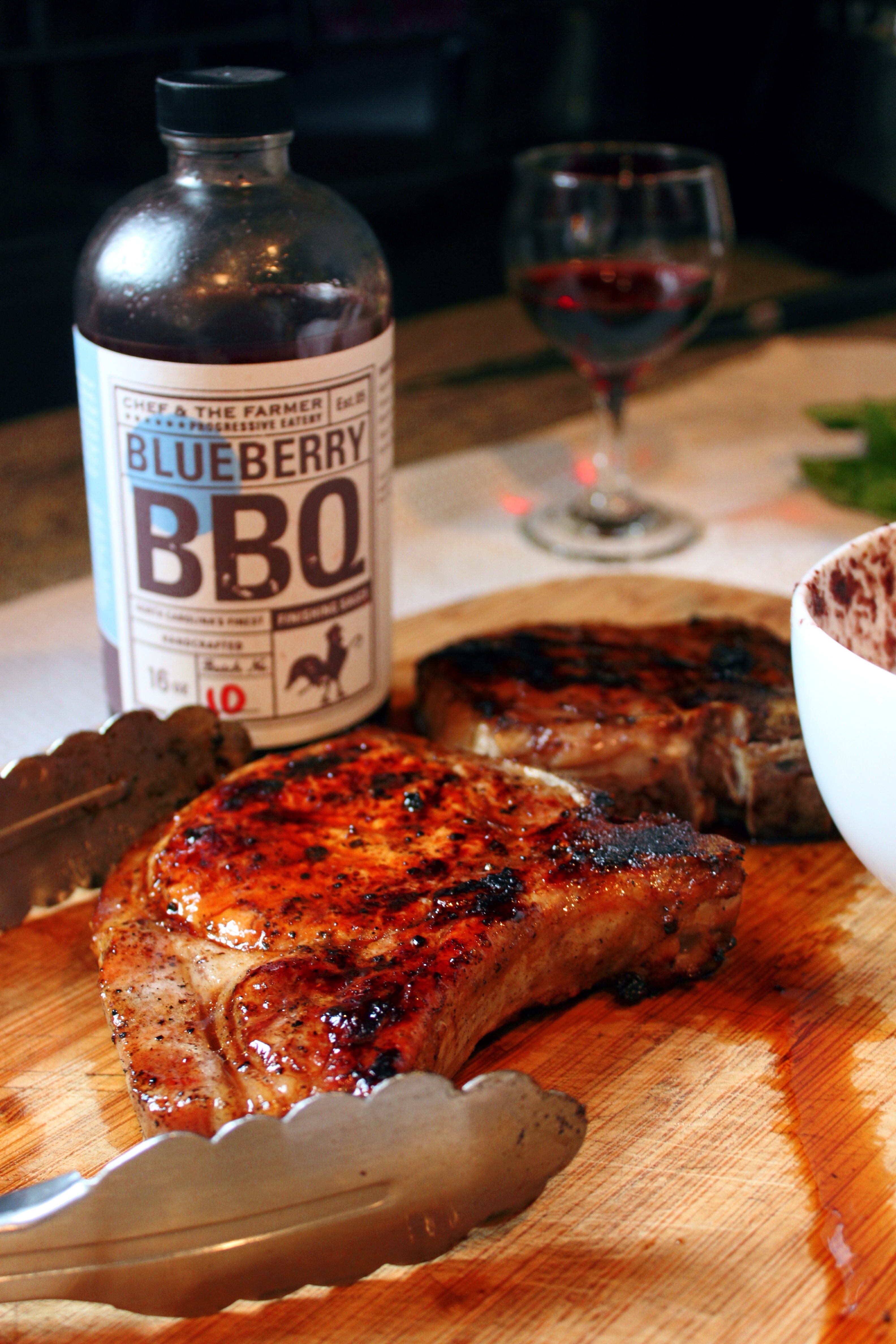 Luckily, the sauce is sold at Southern Season in Chapel Hill and online. It’s a traditional eastern BBQ sauce with a very vinegary bite – but added with a sweet blueberry and spice sweetness that will caramelize just perfectly on any grilled meat. A simple pork chop is all you need. For extra juiciness, I did a easy quick brine on the chop that was no sweat and doused the chops in the sauce while grilling.