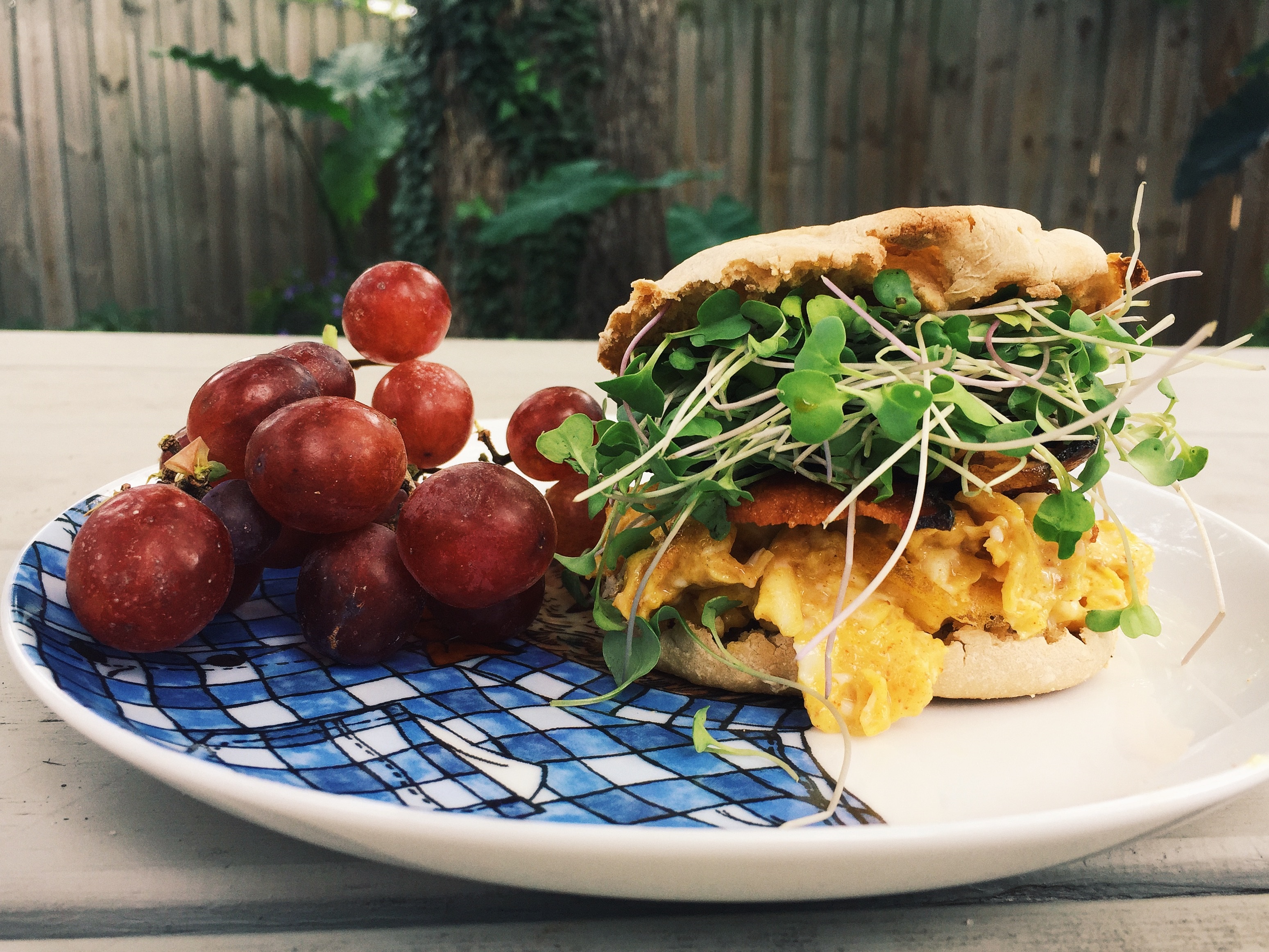 After a beat-your-butt work out this Sunday I treated myself to the ultimate breakfast sandwich. Scrambled eggs with smoked paprika (a must try) on a toasted whole-wheat english muffin with bacon and broccoli sprouts. All in all, not terribly unhealthy considering my bacon to burpee ratio.