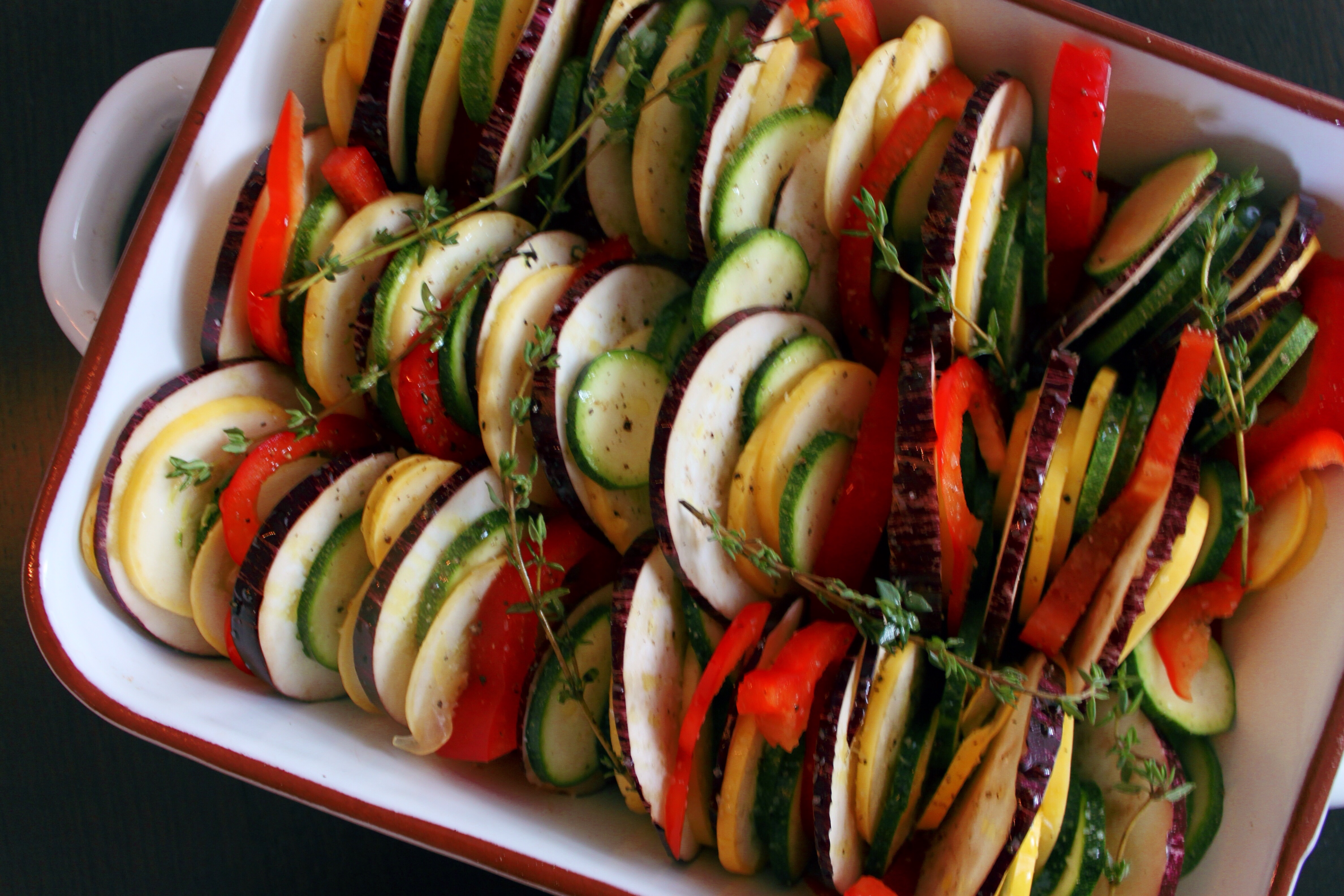 Atop the tomato sauce, arrange slices of prepared vegetables concentrically from the outer edge to the inside of the baking dish, overlapping so just a smidgen of each flat surface is visible, alternating vegetables. You may have a handful leftover that do not fit.