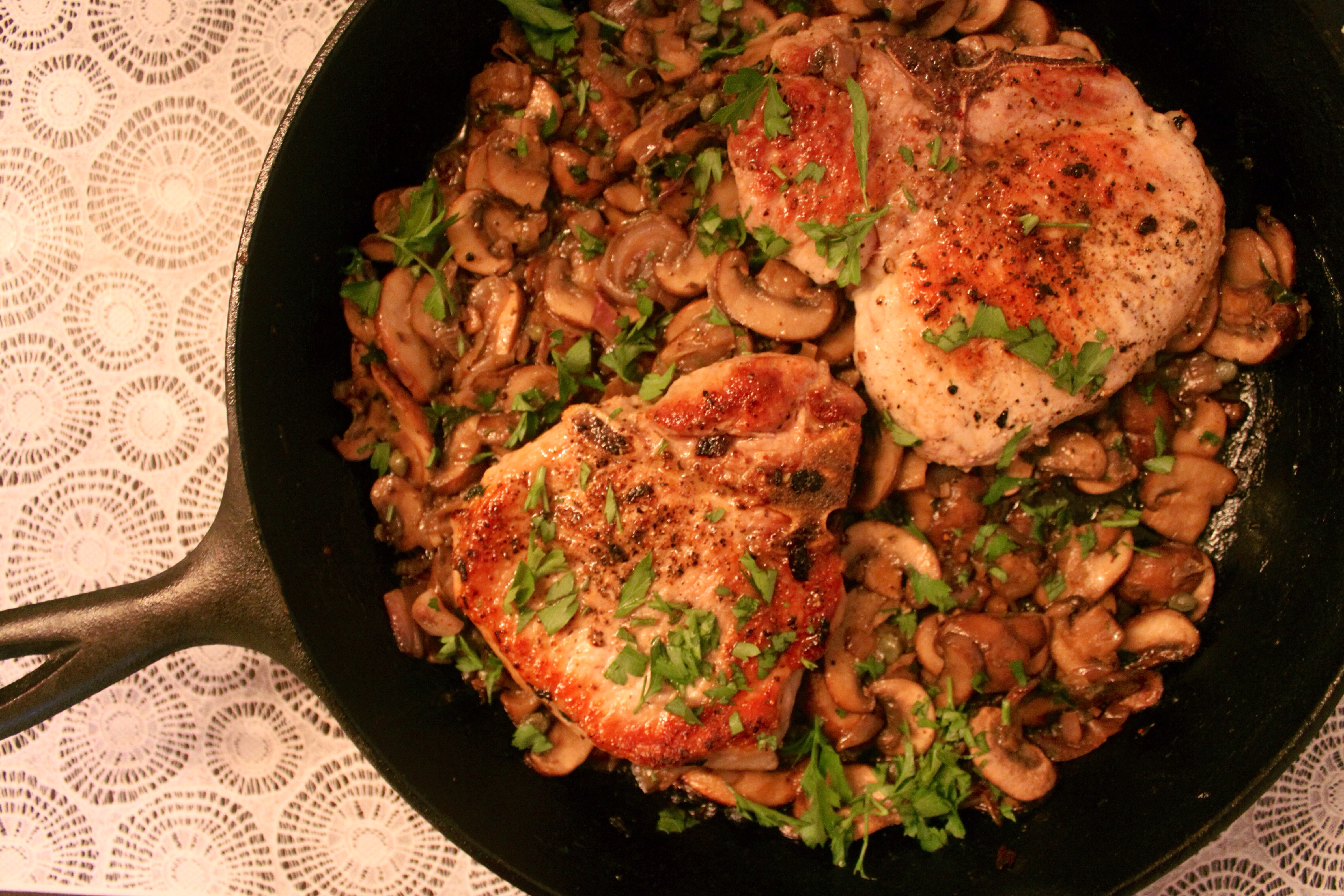 It’s officially the first day of Fall and I’m thrilled to break out my cast iron skillet and dutch oven to start experimenting with new seasonal recipes. Earlier this week I made a quick supper with mushrooms, capers and shallots caramelized in a cast iron skillet with a sauce of white wine and Dijon mustard. Add some browned bone-in pork chops and it’s a full meal. I added some fresh blanched green beans for color and a healthy vegetable.