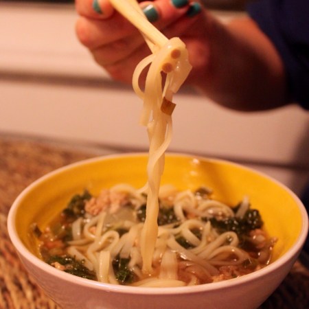Spicy Pork, Kale and Noodle Soup