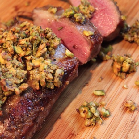 Spring Mustard and Pistachio Crusted Lamb Chops with Goat Cheese Polenta and Port Raspberry Sauce