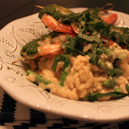 Green Pesto Shrimp Skewers over Spring Pea and Asparagus Risotto